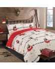 This fun pug themed duvet cover set will brighten your bedroom. The reversible bedding features a pug dog in a festive Christmas winter hat and coat with snow spots on an off white background, sure to add a bold style to your room. With the 'All I want for Christmas' print, this will enhance the Xmas theme. The reverse side features white spots on red, and comes with matching pillow cases. Made from polyester, this bedding set is soft, comfortable and durable. This allows for a more relaxing and comfortable night