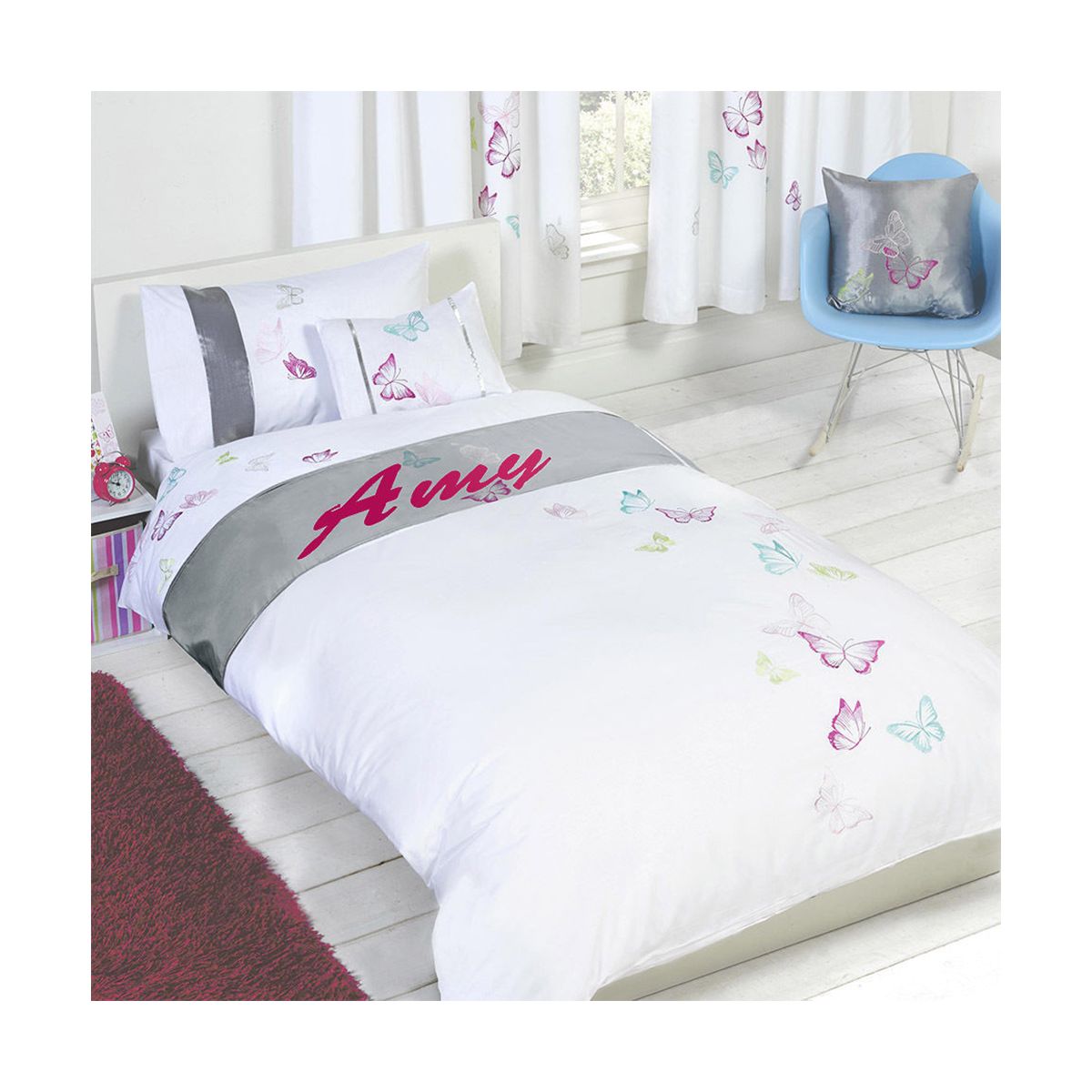 This personalised duvet cover set features embroidered butterfly print and name, this will add a personal touch to your bedroom. Comes with matching embellished detail pillowcases . This duvet set is made from polycotton making it soft, comfortable and durable.