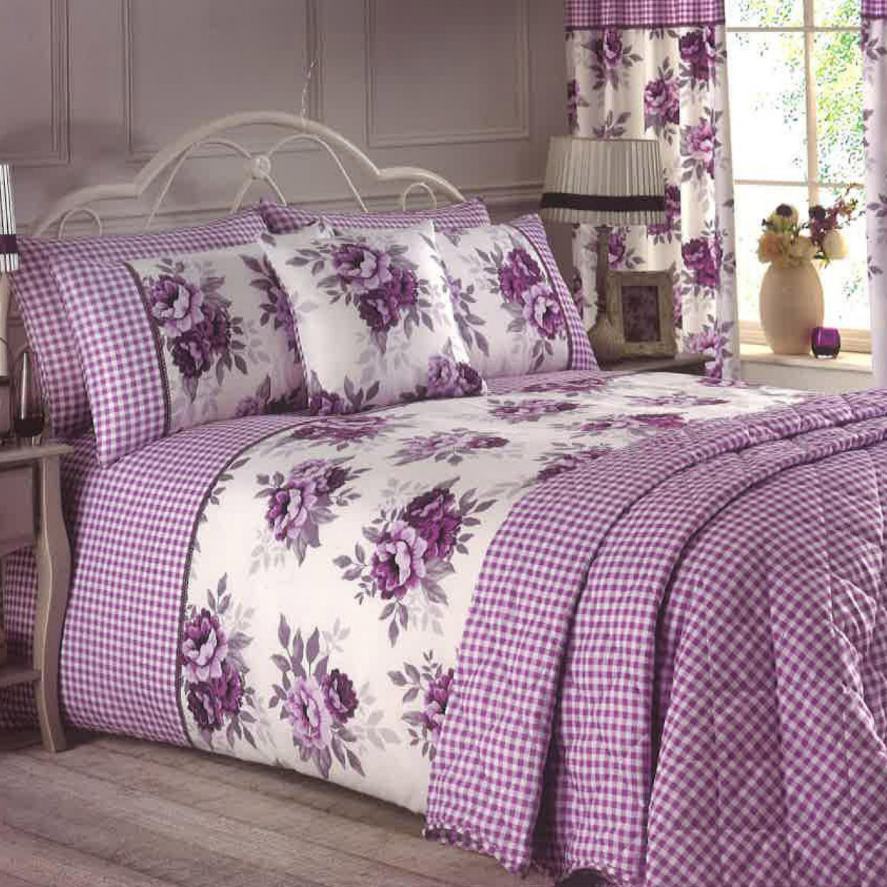 Complete Floral Duvet Cover Set Bedspread and Curtains Bloom Mauve Purple - Double