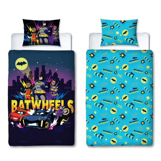 Transform your little hero's bedroom with the Batman Batwheels Characters Reversible Duvet Cover Set. Featuring Batman, Robin and Batgirl in their superhero gear against a nighttime scene of the iconic Gotham City, the front design captures the thrill of the action in deep purples. Flip it over to reveal an energetic blue side, with bold Batman motifs in yellow and black for an extra pop of energy. This fun, reversible duvet set brings Gotham's dynamic style into your child's room, offering two exciting looks in one. Perfect for Batman fans ready to save the day!