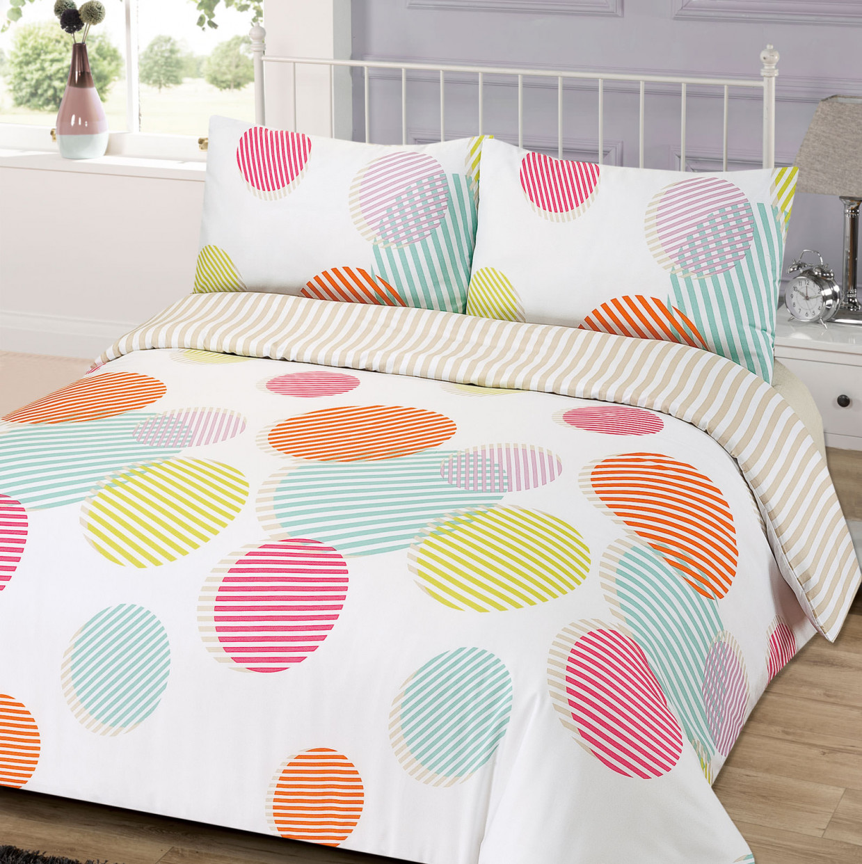 This Bounce duvet set will transform your bedroom with a modern appearance and feel by adding this soft reversible duvet cover set to your bedroom decor. The Bounce reversible bedding has a stylish circle design and colour scheme. Comes with matching pillowcases. This duvet set is made from 100% polyester making it soft and comfortable.