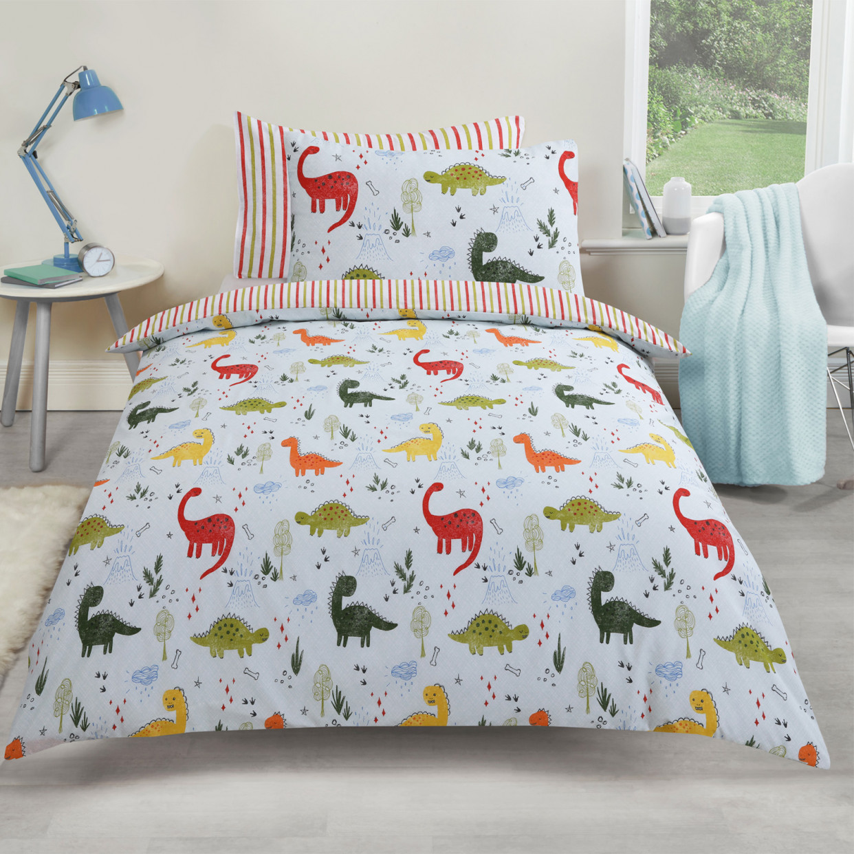 This 2-in-1 reversible duvet cover set from OHS's Premium range will be sure to brighten your room with it's fun animal print Dinosaur design. The reverse side features a matching striped line on the and the set comes with matching pillow case(s). This dinoduvet is made from a soft polycotton blend, 50% cotton and 50% polyester. This bedding set is soft, comfortable and durable, allowing for a relaxing nights sleep. Available in the following sizes:-