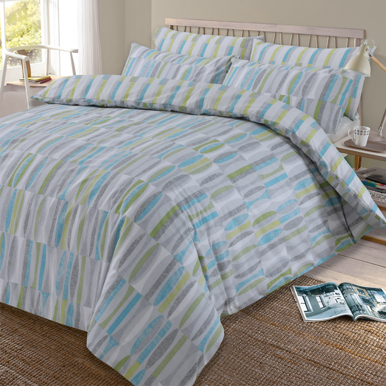 OHS Ellipse Duvet Cover with Pillow Case Reversible Geometric Bedding Set, Teal Green Grey Silver - Superking