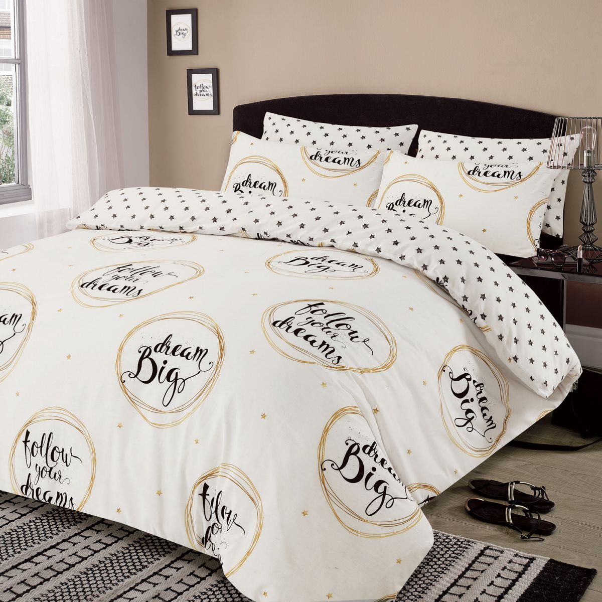 This 2-in-1 follow your dreams print reversible duvet cover set from the OHS Premium range is sure to add a modern style & warmth to your room decor. The reverse side features a black star print that compliments the 'follow your dreams' and 'dream big'. This set comes with matching pillow cases. Made from 56 pick polycotton, this bedding set is soft, comfortable and durable, leading to a better relaxation and nights sleep. Available in the following sizes:-