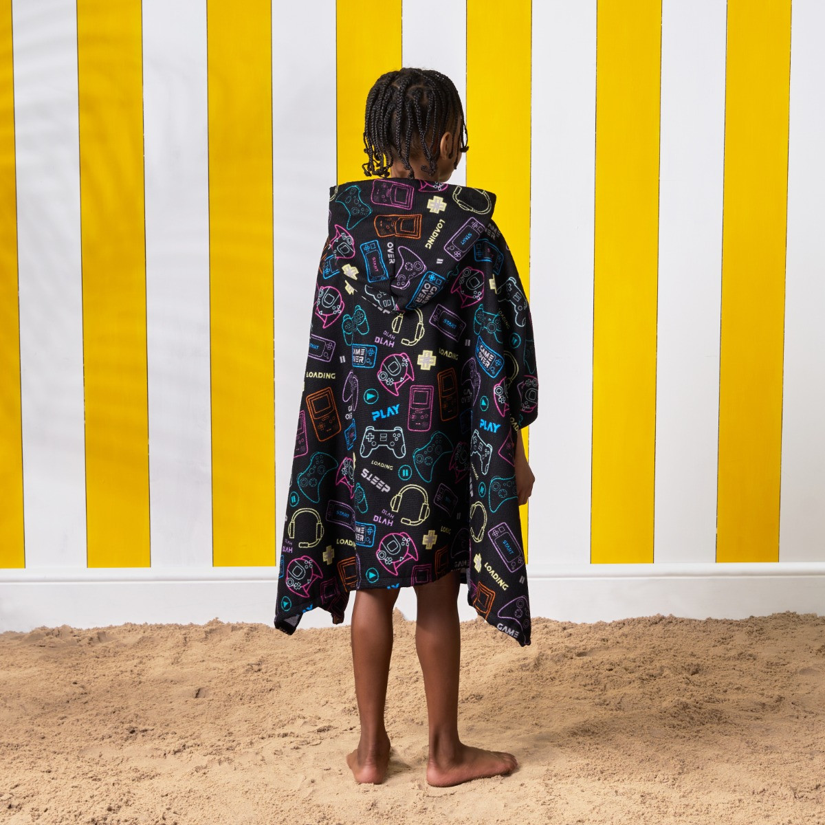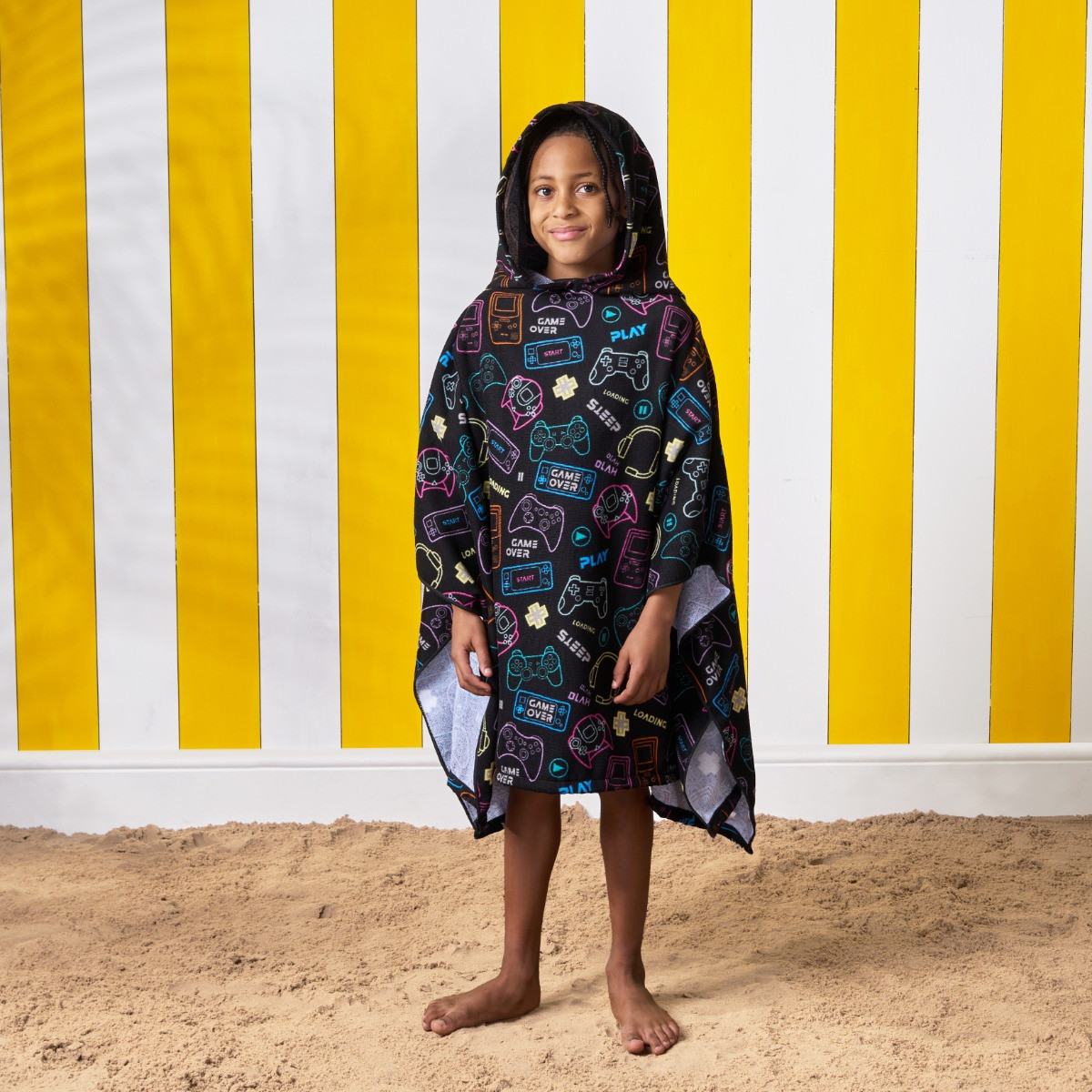 Introducing the OHS Gaming Print Beach Poncho Towel in Black – the perfect fusion of style and functionality for the avid young gamer. This beach poncho towel is brings the excitement of gaming to every beach or poolside adventure. Adorned with dynamic gaming motifs against a sleek black background, this poncho towel caters to the gaming enthusiast's sense of style. The cool and edgy design captures the essence of the gaming world, making it an ideal choice for those who love to showcase their passion even by the water. Crafted with high-quality microfibre, the OHS Gaming Print Beach Poncho Towel not only keeps your child dry but also adds an extra layer of comfort. The poncho style makes it easy to slip on and off, providing convenience for on-the-go activities.