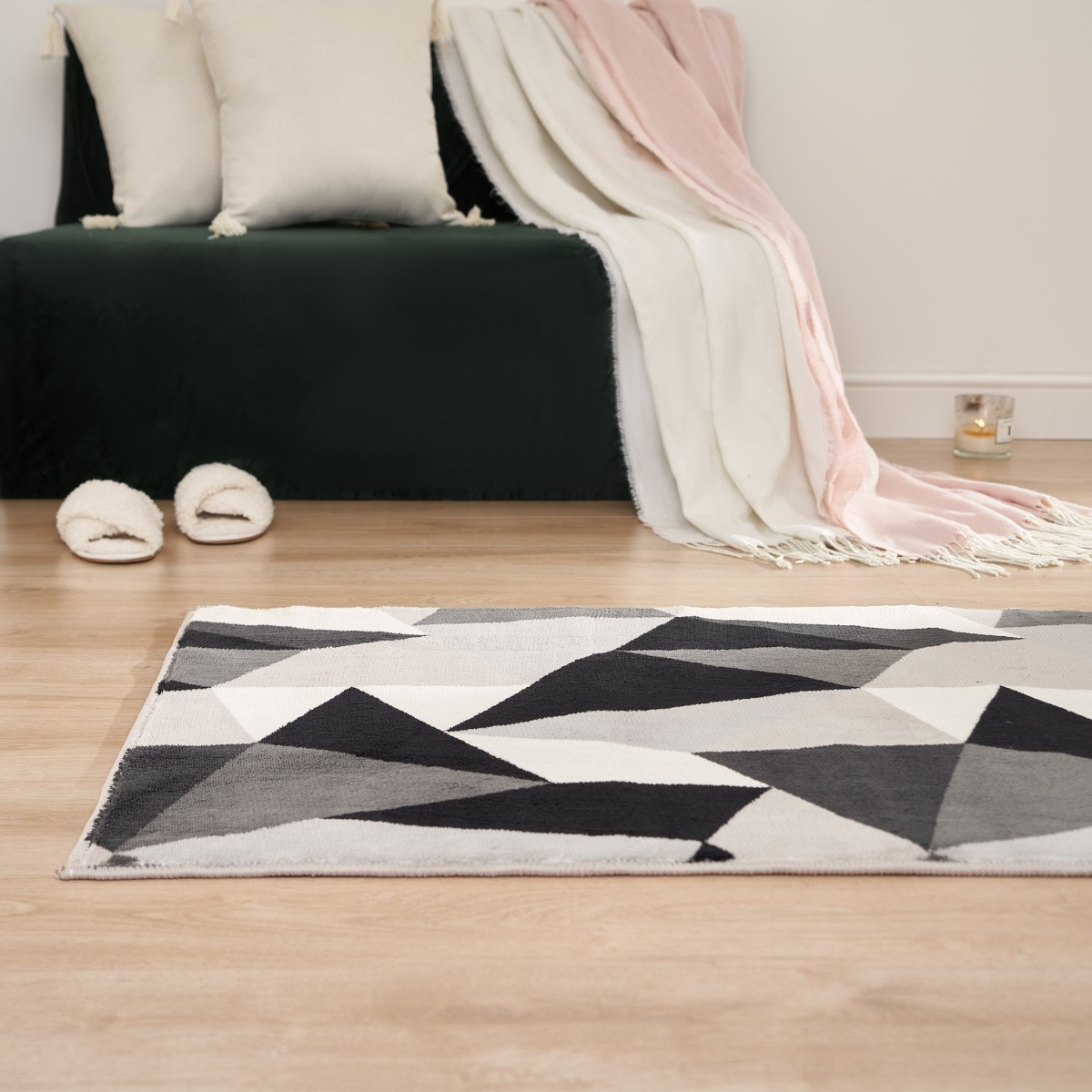 This modern printed fleece floor rug from the OHS range will add a fresh look with its soft Warm touch, and the short smooth fibres ensure a cosy stylish look. Crafted in a traditional rectangle shape, with a prin ted geometric design, ensures this rug can be paired with a variety of colours and be a statement piece in any room. With its non-shed qualities and stitched edges, this modern runner rug is soft, durable and long lasting, adding a vibrant colour to any room. The PVC dot backing means this is, non-slip and perfect for wooden floors and practical use. Available in the below sizes: