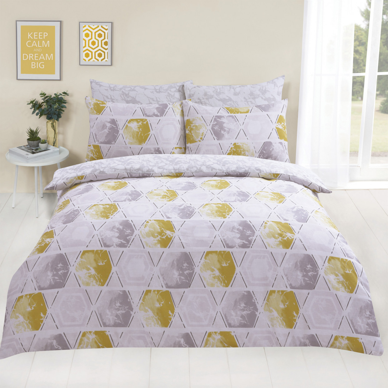 This 2-in-1 reversible duvet cover set from OHS's Premium range will be sure to modernise your room with it's marble hexagonal patterned design. The reverse side features a modern marble effect reverse pattern and the set comes with matching pillow case(s). This honeycomb print duvet is made from a soft polycotton blend, 50% cotton and 50% polyester. This bedding set is soft, comfortable and durable, allowing for a relaxing nights sleep. Available in the following sizes:-