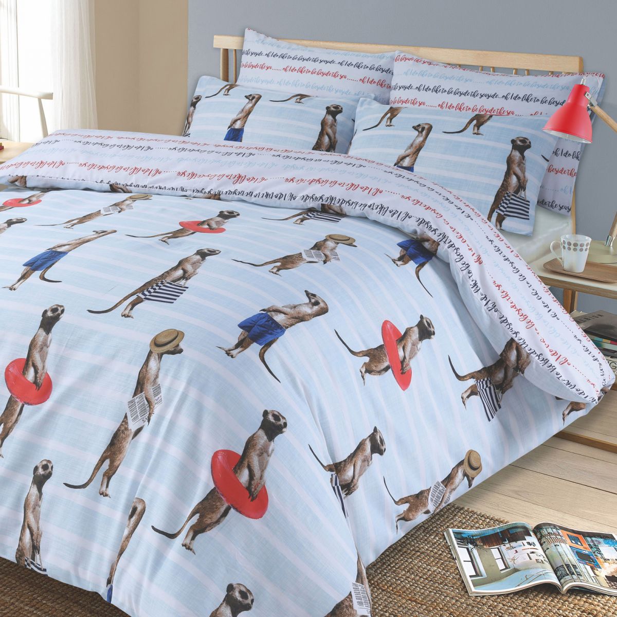 This 2-in-1 reversible duvet cover set from OHS's Premium range is sure to modernise your room with its fun Meerkat animal print and striped design. The reverse side features the slogan 'oh I do like to be beside the seaside' in alternating coloured fonts and the set comes with matching pillow case(s). Made from a soft polycotton blend, 50% cotton and 50% polyester. This bedding set is soft, comfortable and durable, leading to better relaxation and a good nights sleep. Available in the following sizes:-