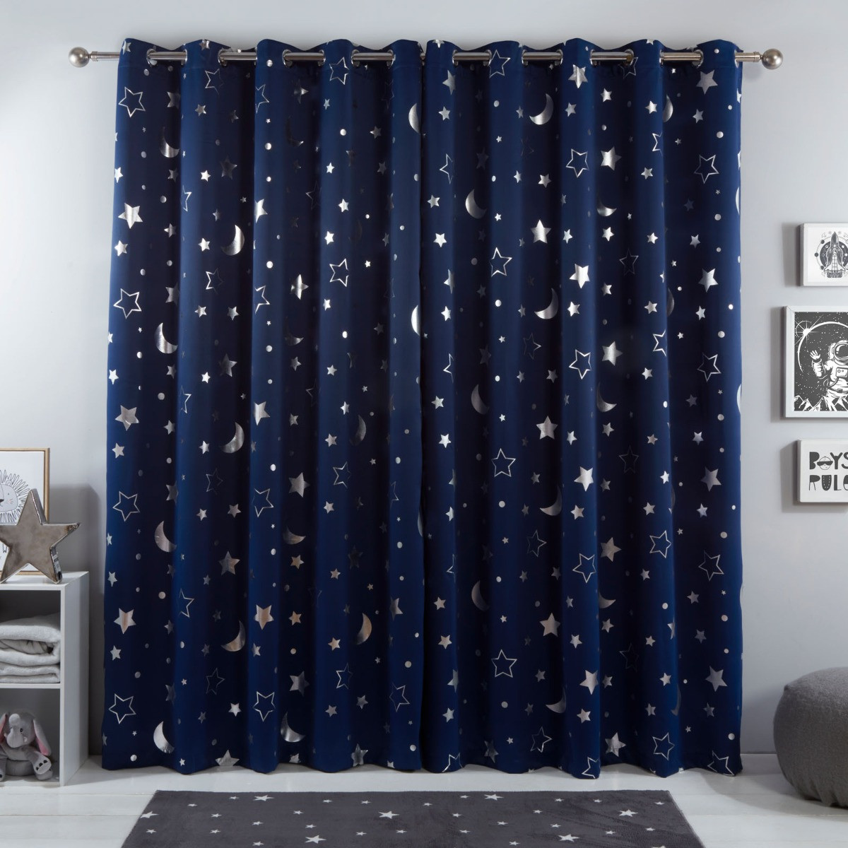 Turn bed time into a fun and loving atmosphere with these Galaxy blackout curtains from the OHS. Energy efficient for maximum insulation, these curtains keep heat in and light out. These heavyweight eyelet ring top thermal curtains will transform your room with its blackout qualities and unique supersoft drape material of soft sheen with metallic moon and stars. This is a double face curtain i.e. moon and stars pattern on face and plain matching colour on the reverse, with the blackout weave lining inside, and is perfect for any room. The eyelet ring top makes this easy to hang and easy care.