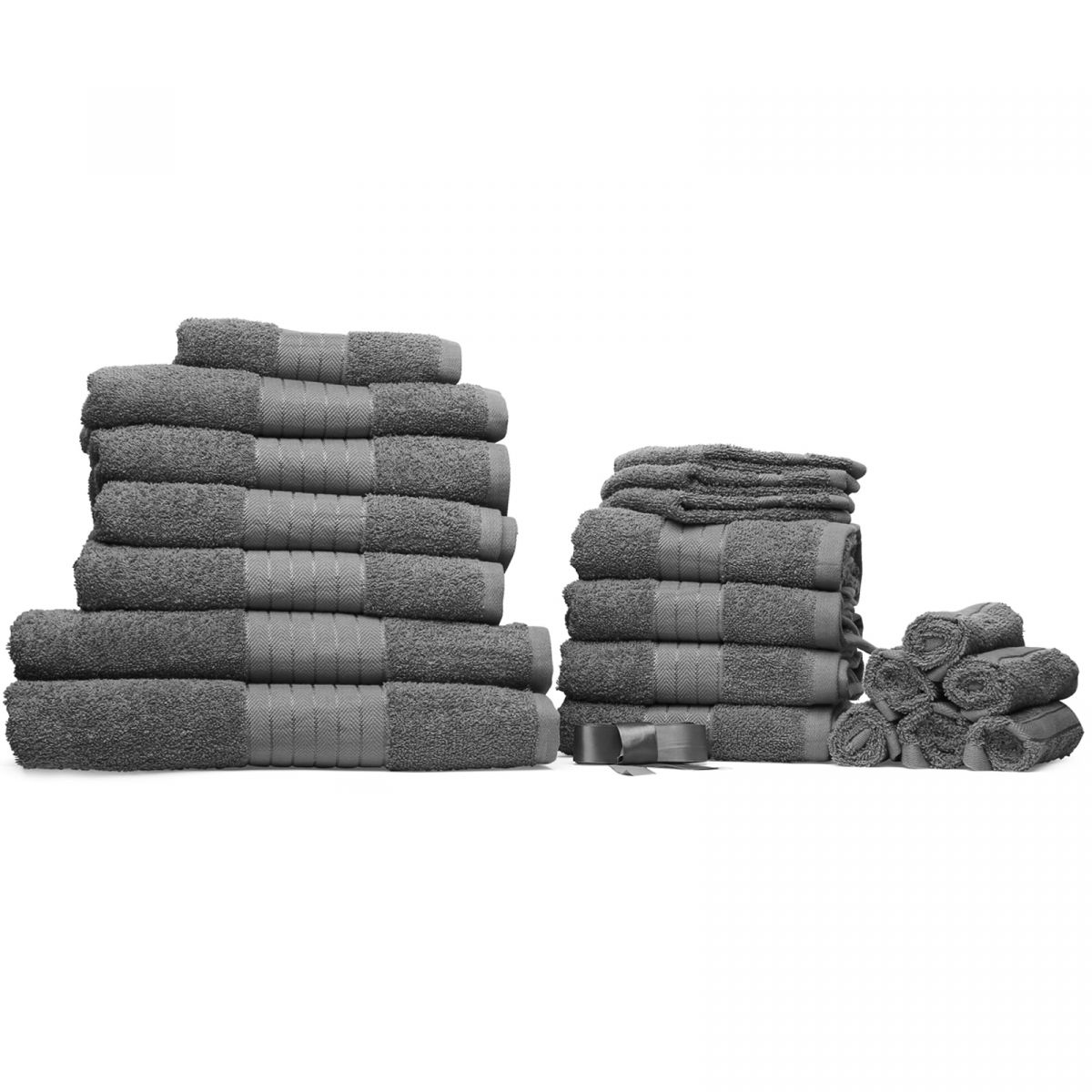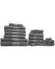 Includes: 9 x face cloths (W30cm x L30cm), 5 hand towels (W50cm x L80cm), 4 x bath towels (W70 x L115cm), 2 x bath sheets (90cm x 140cm)