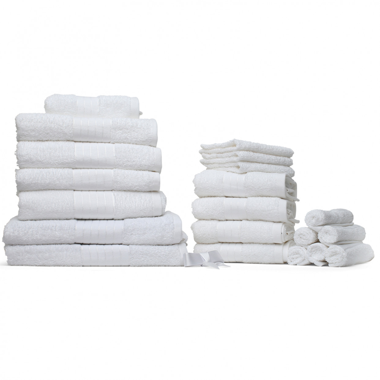 Includes: 9 x face cloths (W30cm x L30cm), 5 hand towels (W50cm x L80cm), 4 x bath towels (W70 x L115cm), 2 x bath sheets (90cm x 140cm)