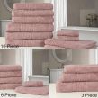 2 Face Cloths (W30xL30cm), 2 Hand Towels (W50cm x L80cm), 3 Bath Towels (W70XL115cm) and 3 Bath Sheets (W90xL140cm)