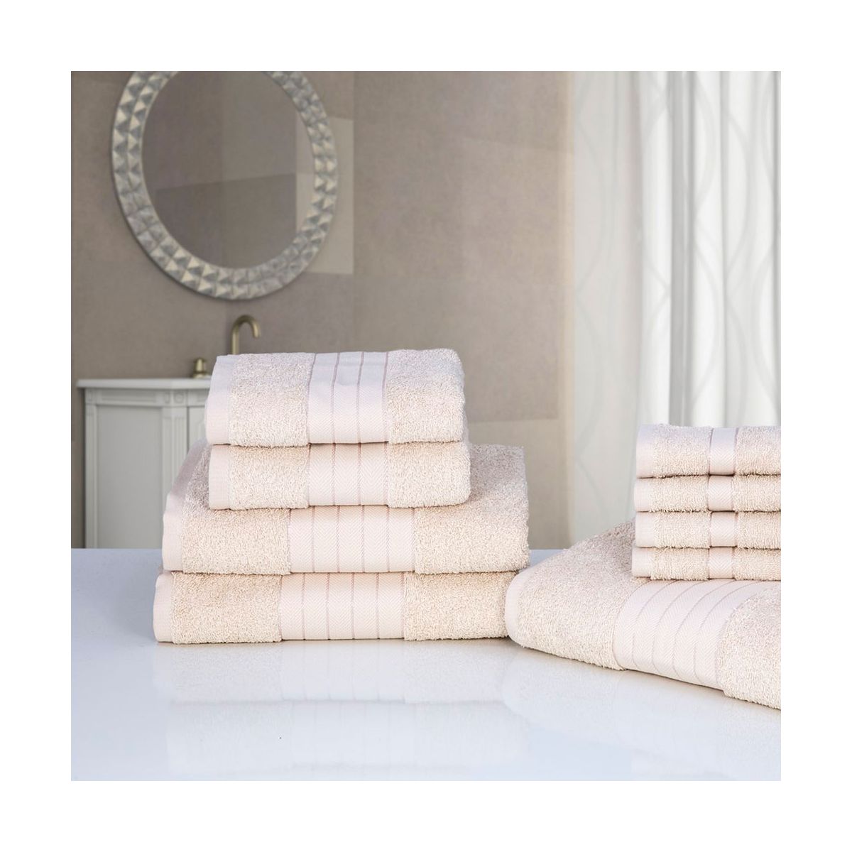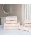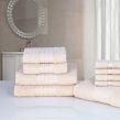 Includes: 4 x face cloths (W30 x L30cm), 2 x hand towels (W50cm x L80cm) 2 x bath towels (W70 x L115cm), 1 bath sheet (W90cm x L140cm)