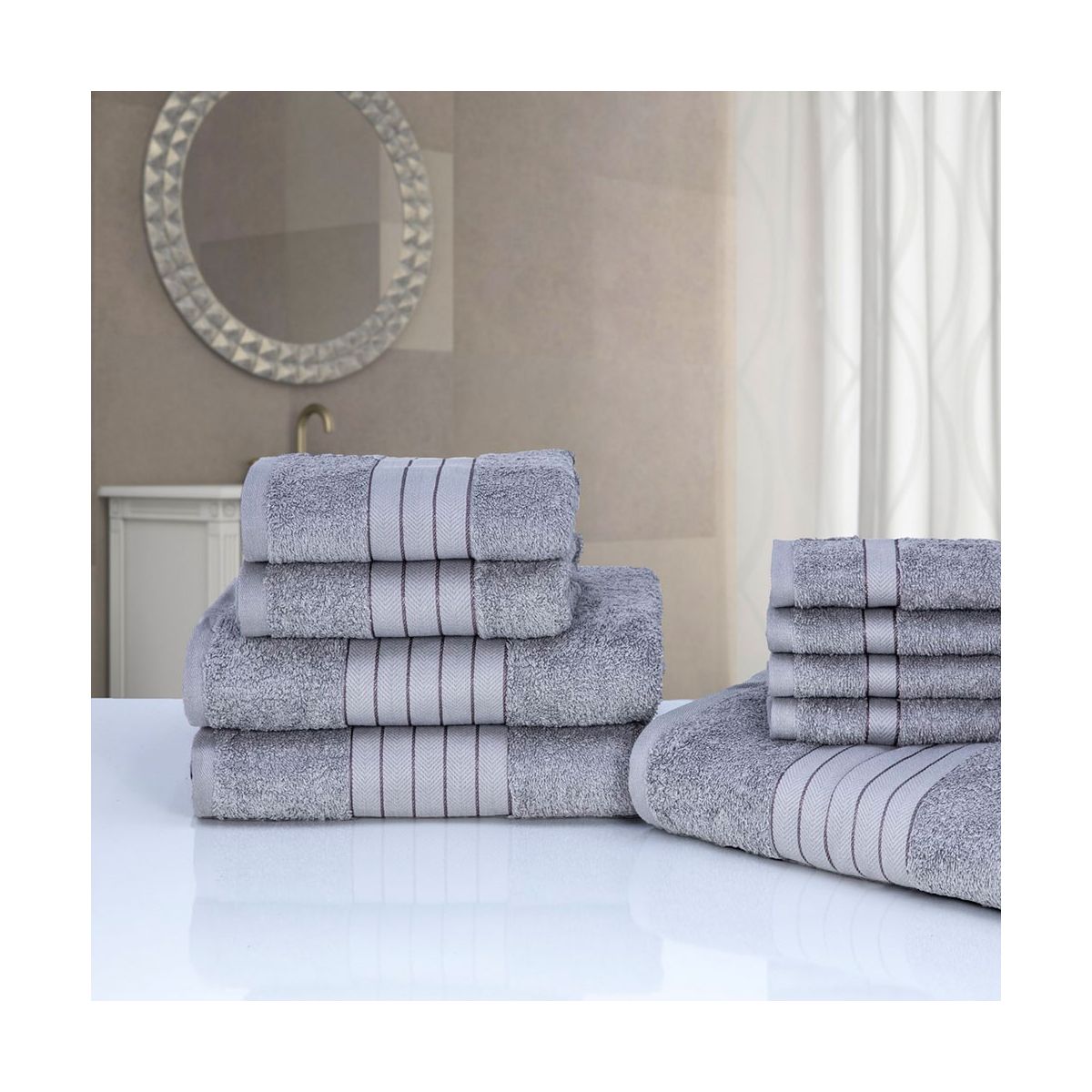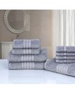 Includes: 4 x face cloths (W30 x L30cm), 2 x hand towels (W50cm x L80cm) 2 x bath towels (W70 x L115cm), 1 bath sheet (W90cm x L140cm)