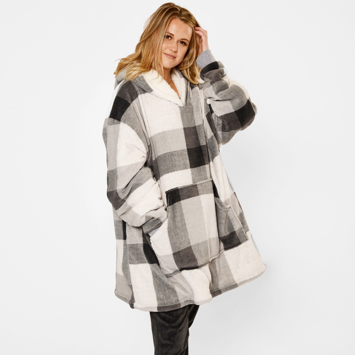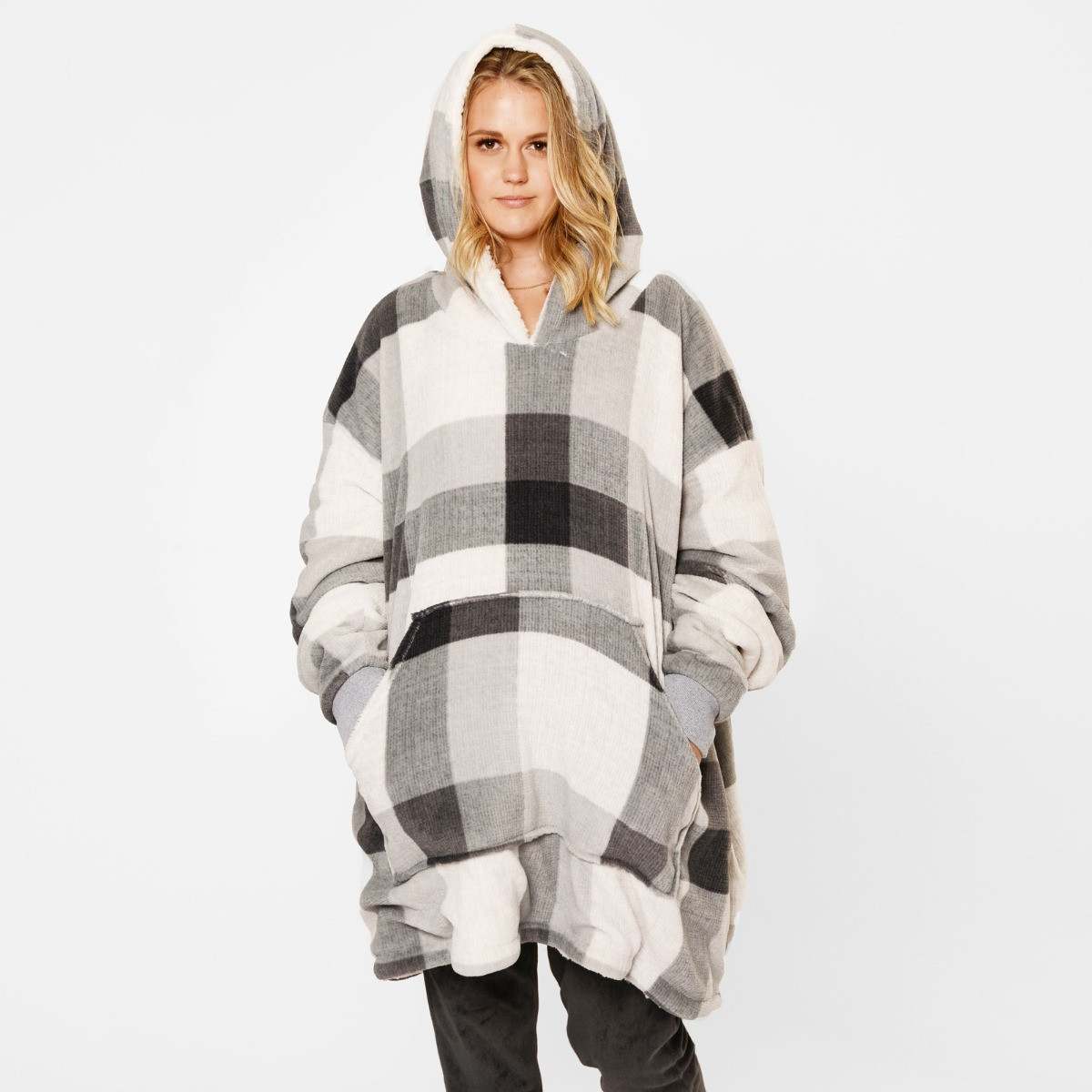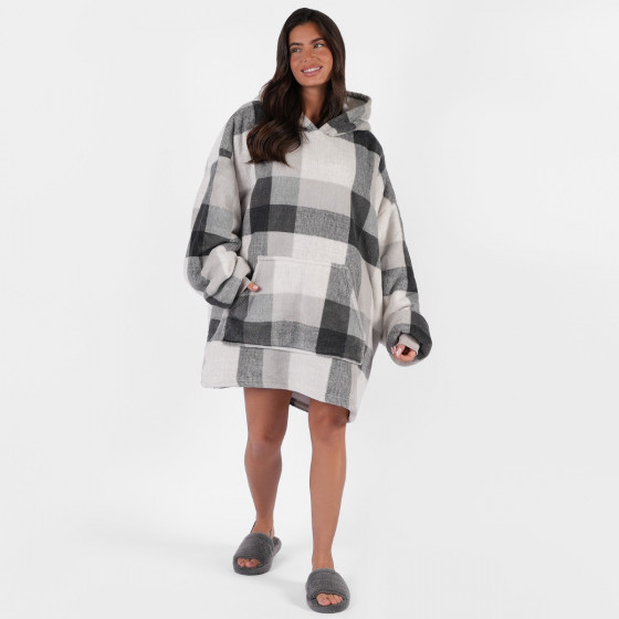OHS Tartan Winter Check Sherpa Hoodie Blanket, Adults - Grey
