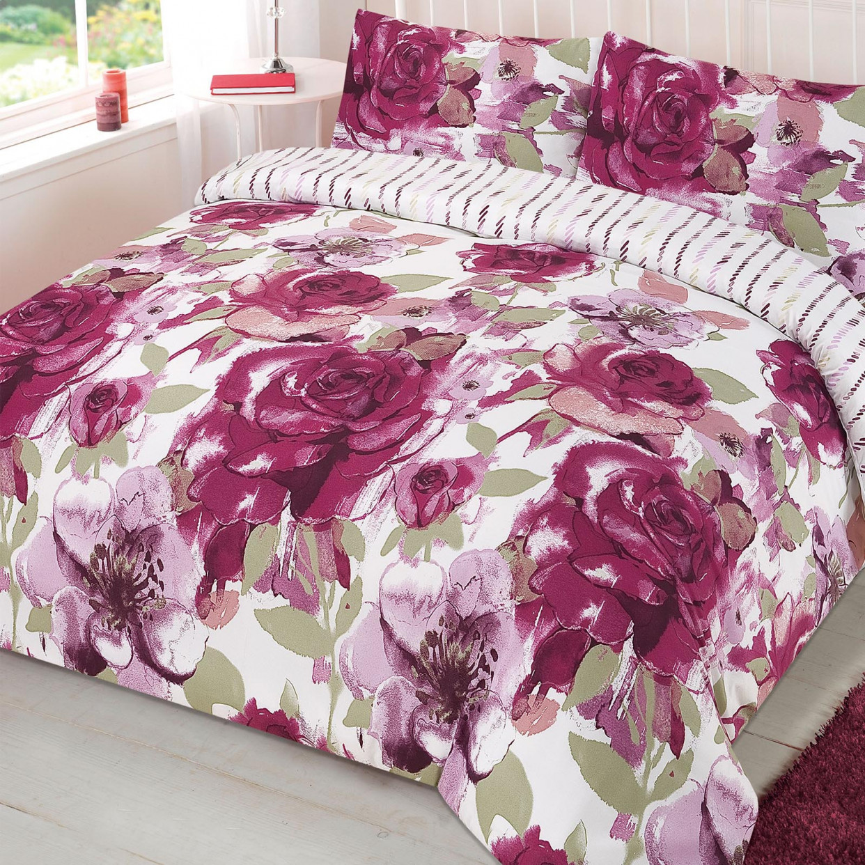 Colour: Purple & white floral print with a reversible blue, purple, white striped print duvet set.