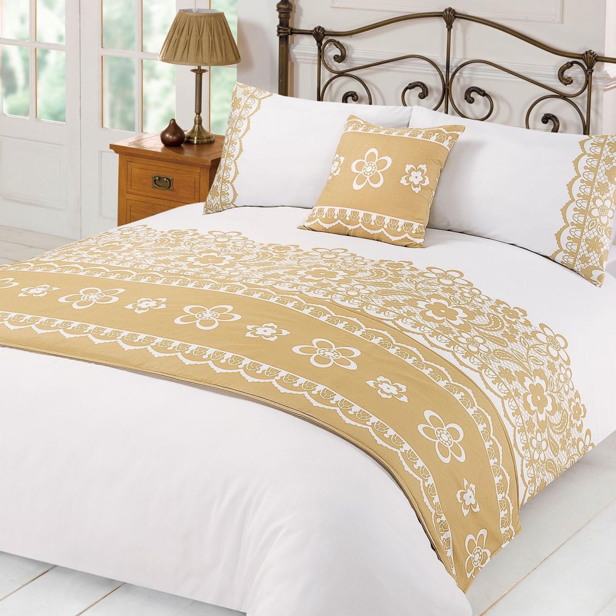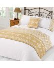 This Hannah lace design bed in a bag lends an exotic touch to your bedroom with its adoring lace panel design boasting elegant and tasteful florals. This beautiful bed in a bag set complements a wide range of decor styles with its gold and white colour palette. The set includes duvet cover, pillowcase(s), bed runner, and a cushion cover. The quality polyester construction will keep the duvet set looking new and fresh without compromising on the comfort.