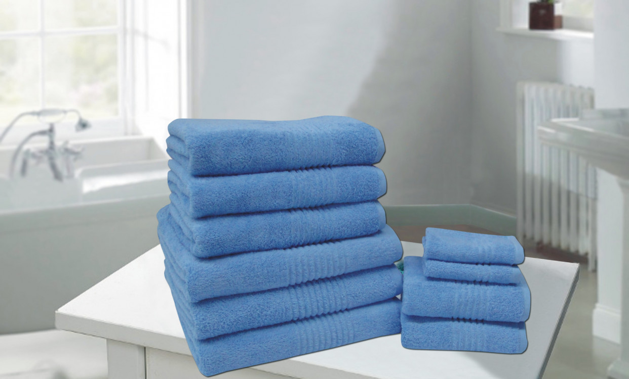 2 Face Cloths (W30xL30cm), 2 Hand Towels (W50cm x L80cm), 3 Bath Towels (W70XL115cm) and 3 Bath Sheets (W90xL140cm)