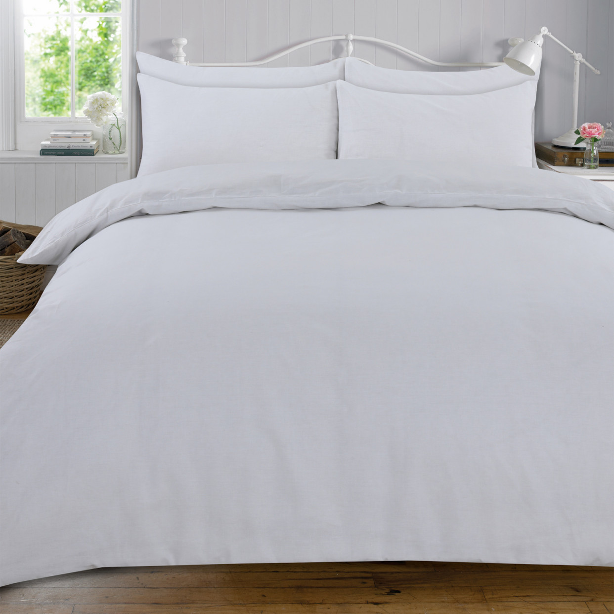 OHS Plain 100% Cotton Complete Duvet Cover Pillowcase Sheet Set, White - Double