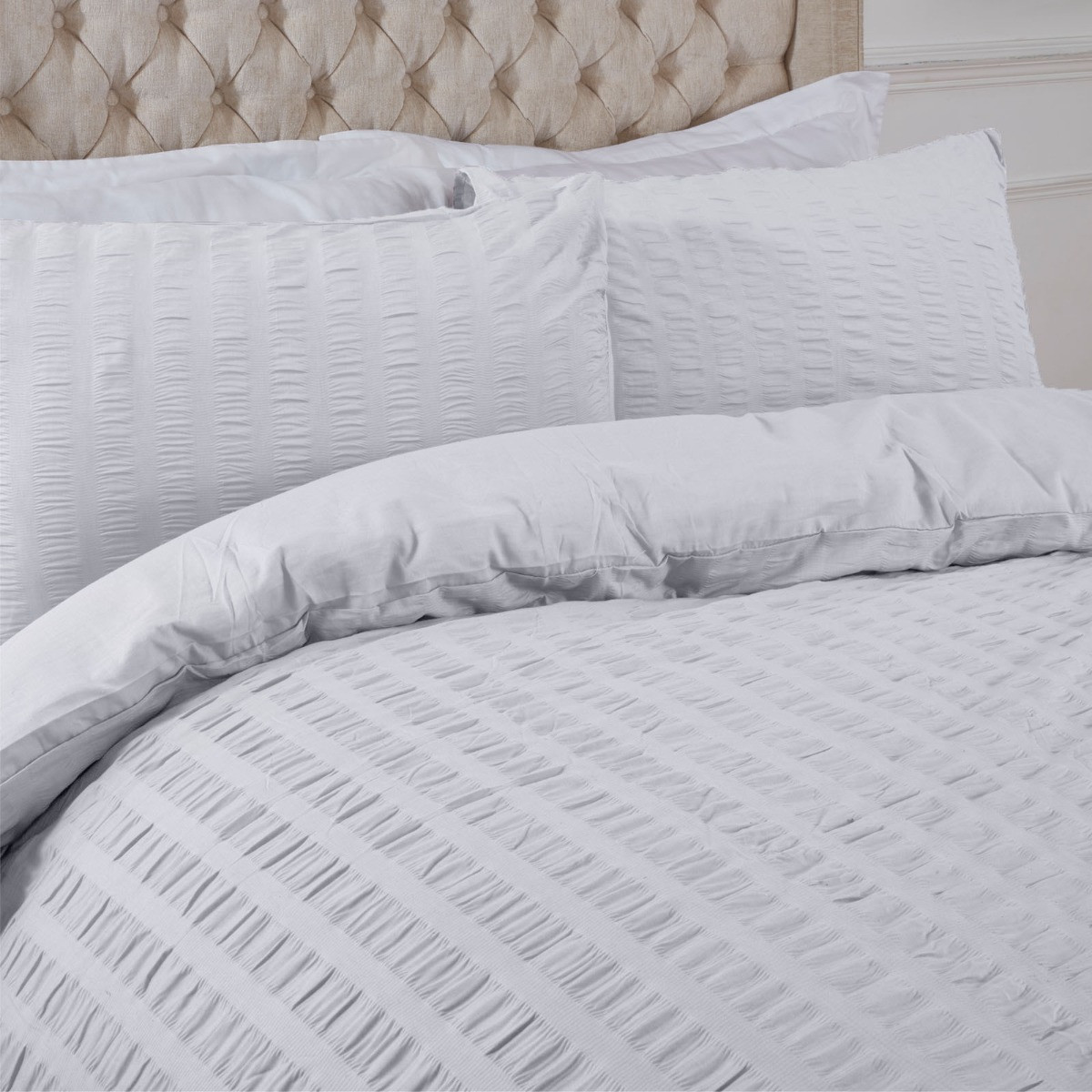 This contemporary duvet cover set from OHS is a bed linen design which will add a clean modern finish to any bedroom. With its ruffled seersucker design on the front, and the plain polycotton on the reverse, this set comes with matching pillow case(s). This Hotel quality bedding set is made from a breathable, soft, comfortable and durable material, which will ensure a relaxing nights sleep, whilst retaining easy care qualities. Available in the following sizes:-