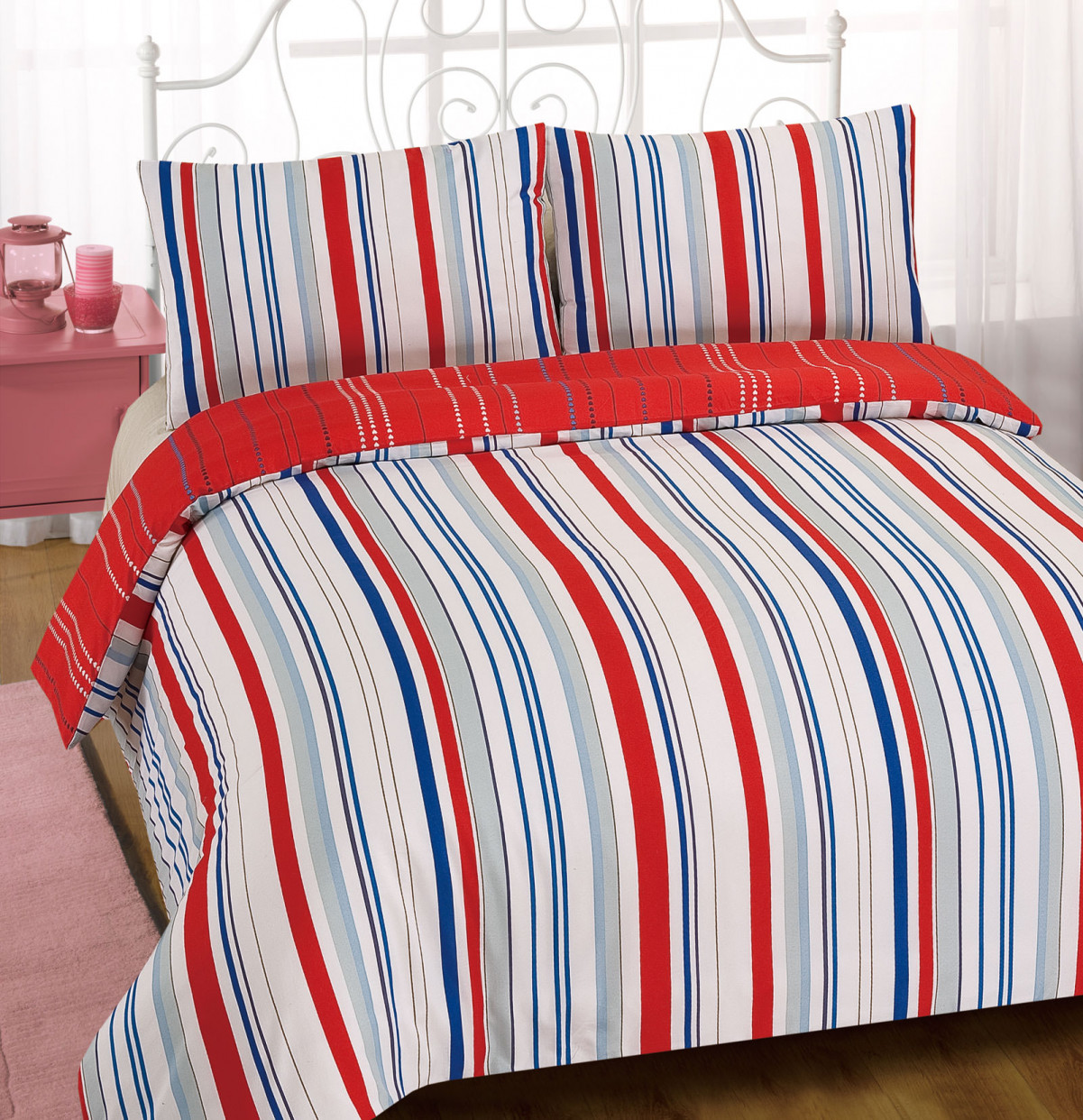 This Karla duvet set will transform your bedroom with a modern appearance and feel by adding this soft duvet cover set to your bedroom decor. The Karla striped bedding set has a stylish design and reversible hearts print colour scheme. Comes with matching pillowcases. This duvet set is made from 100% polyester making it soft and comfortable.