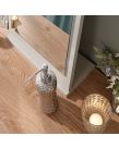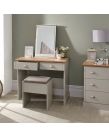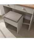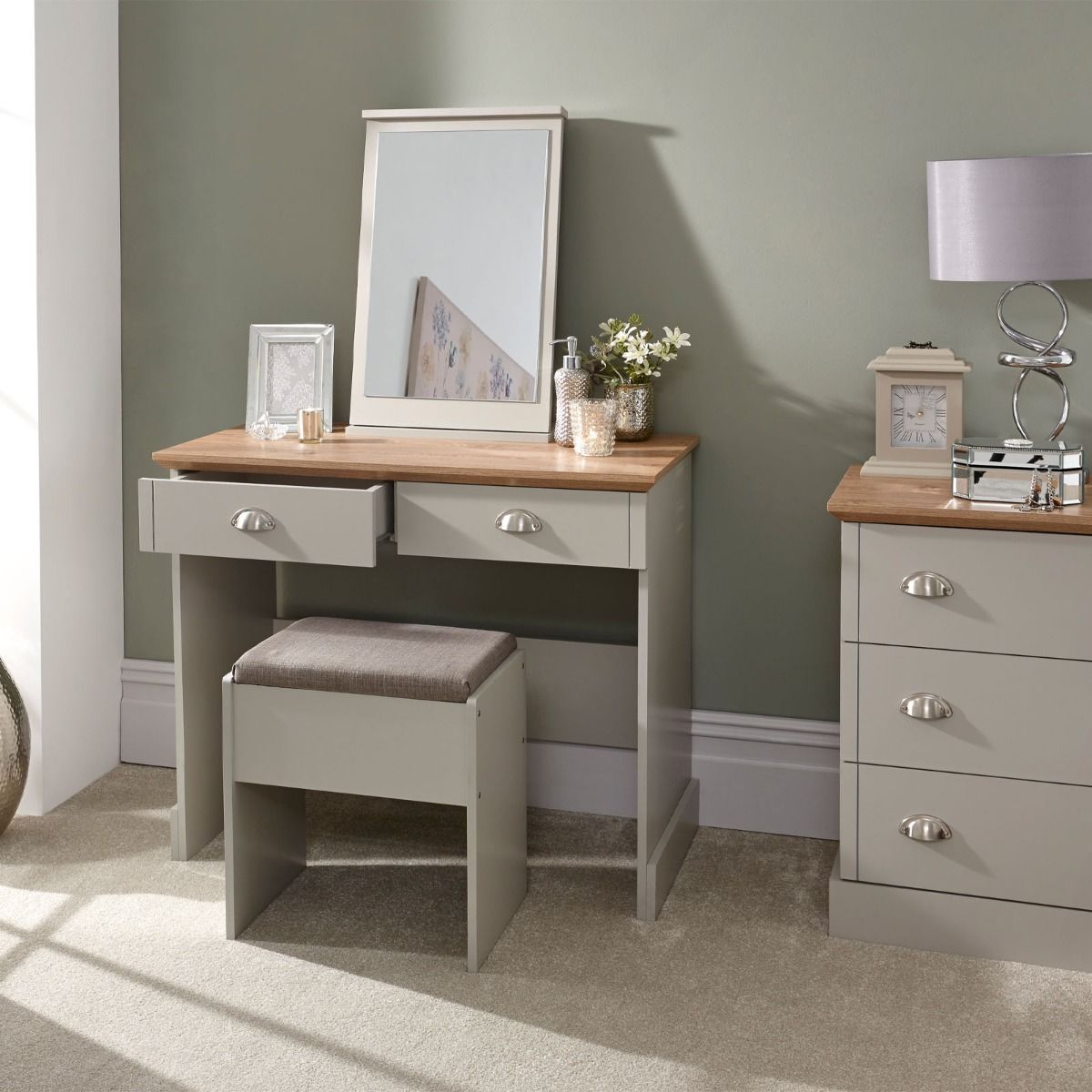 A versatile dressing table is always a smart choice for a bedroom, offering a handy repository for pots and potions and creating a one-stop station for hair and makeup. This cool Kendal set features a console-style table with integrated drawers and oak-effect top plus matching mirror and upholstered stool in soft grey. The stool tucks neatly away when not in use. Thick Oak-effect top with feature design bevel creates a stunning high-quality look and feel. Angled table-top mirror included finished with matching colour and Oak-effect top. With two 19.5 Litre storage drawers it offers plenty of room for all your needs. Assembled Size: 137 x 90 x 45