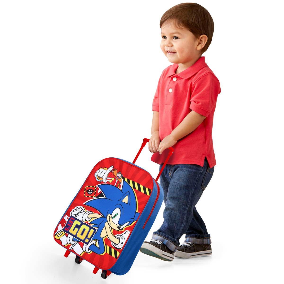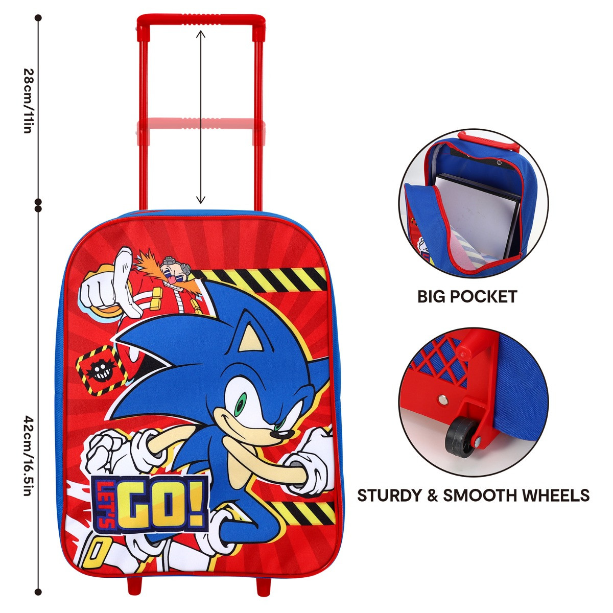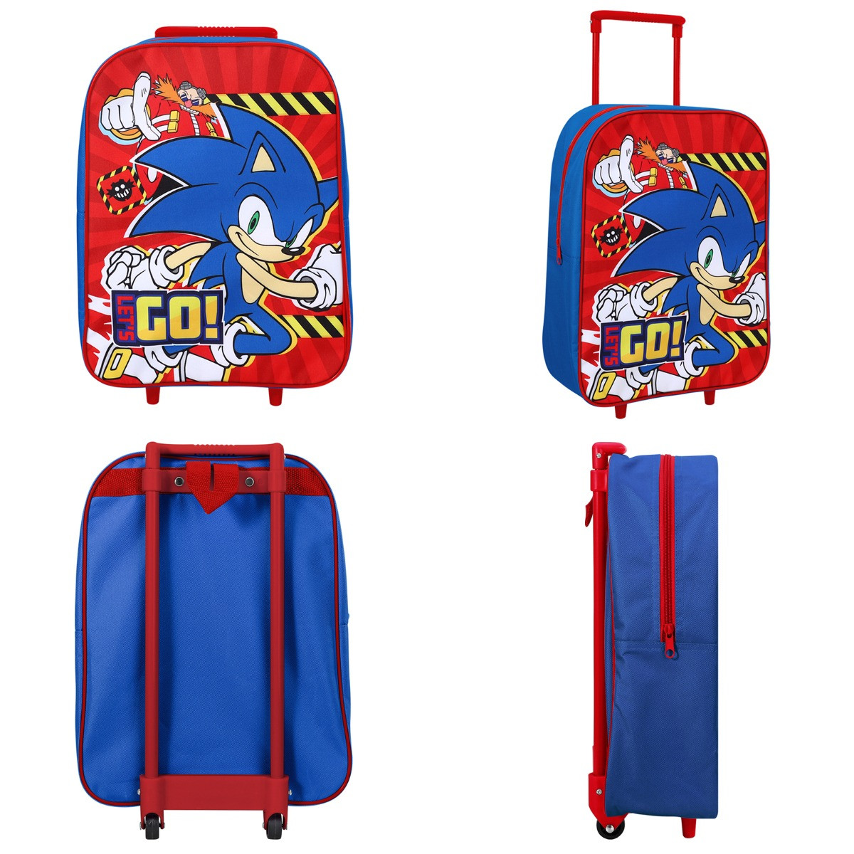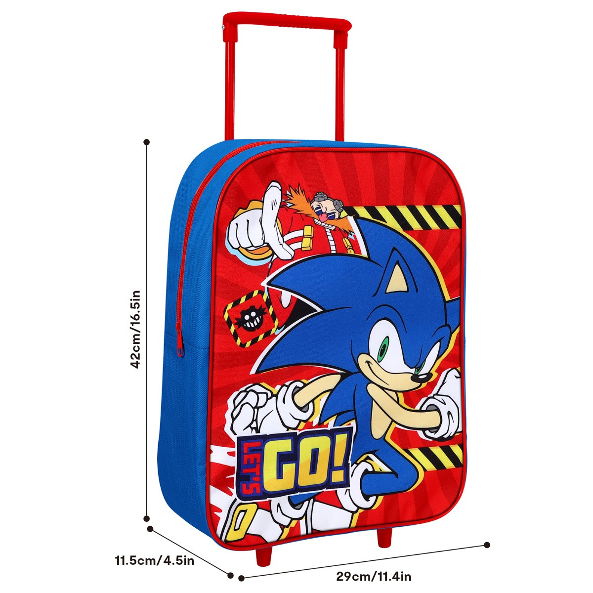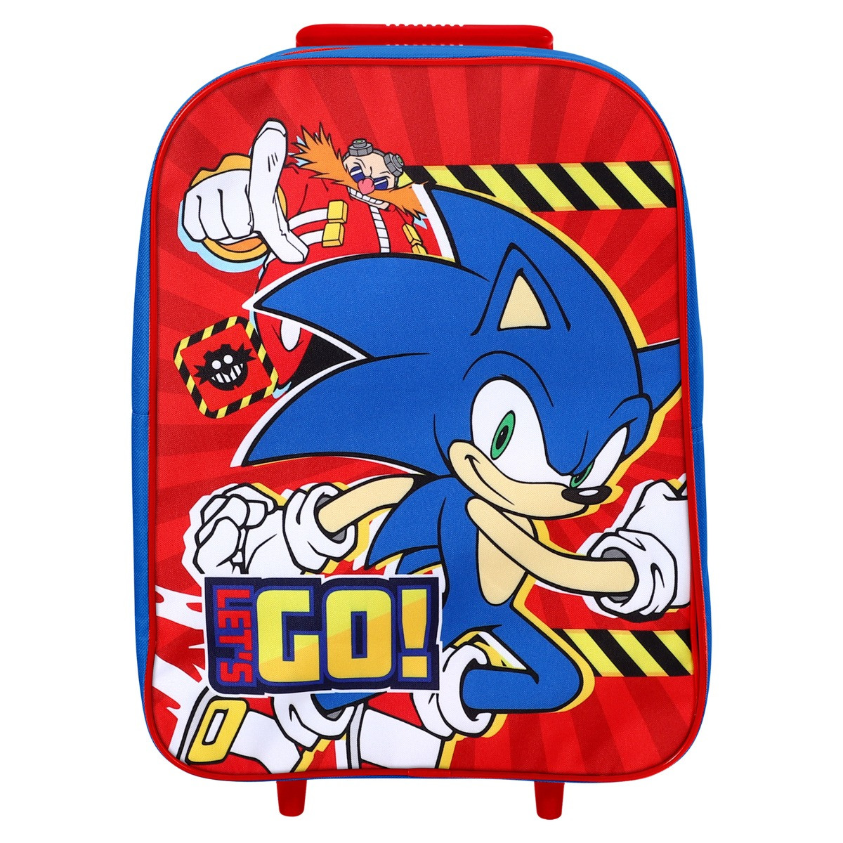 The Kids 2 Wheel Sonic Trolley Bag is an exciting and practical accessory for young Sonic fans. Showcasing Sonic darting away from Doctor Eggman, it features the energetic slogan "Let's Go" printed on the front. Perfect for school trips, vacations, or sleepovers, this trolley bag combines fun with functionality, offering easy maneuverability with its two-wheel design and ample storage space for all essentials.