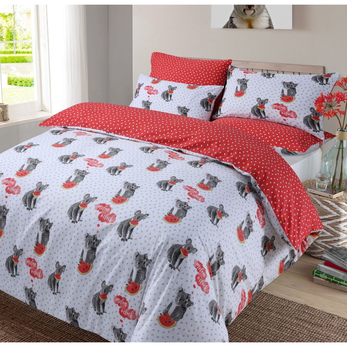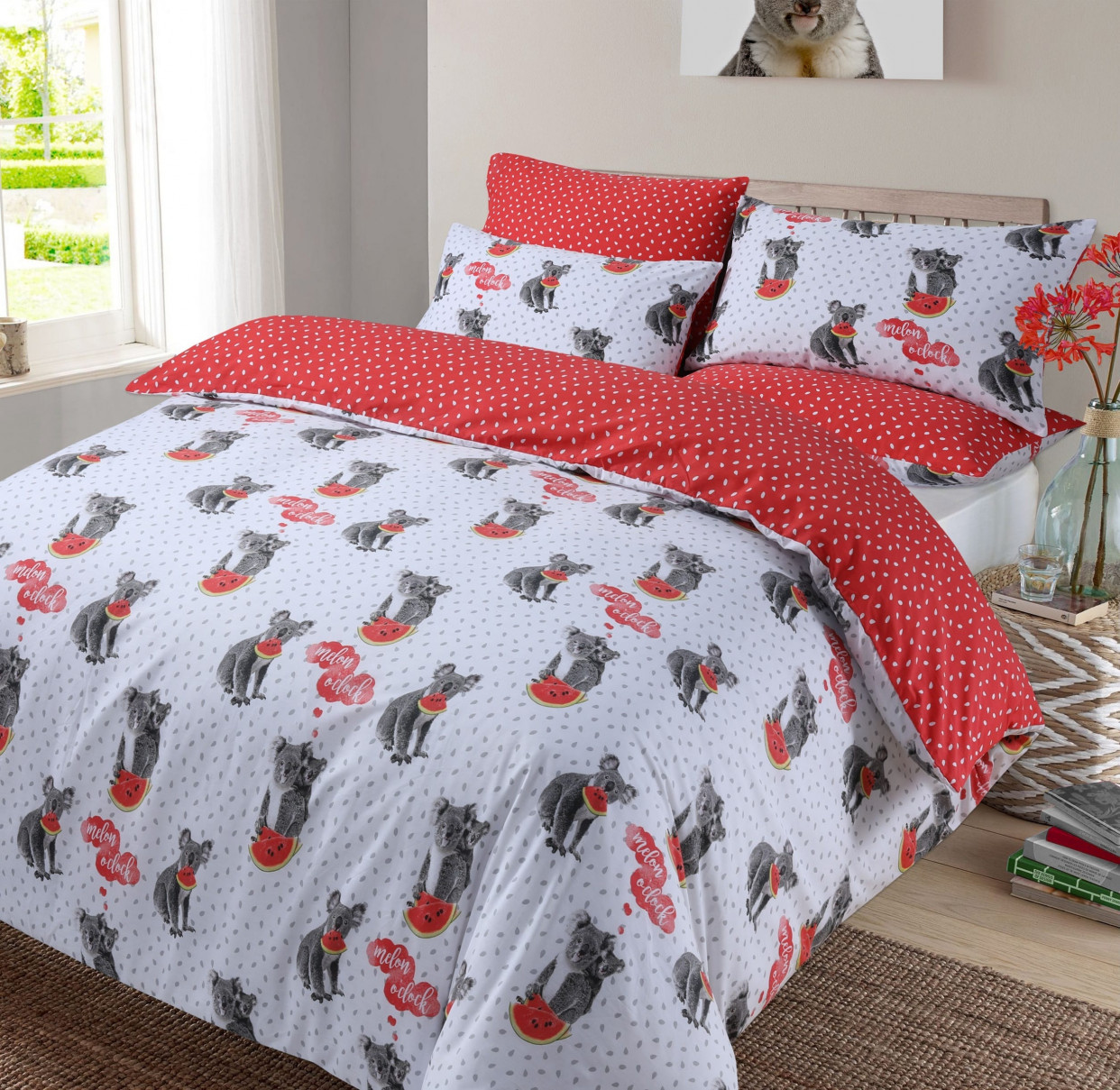 This 2-in-1 reversible duvet cover set from Dreamscene's Premium range is sure to modernise your room with it's cute Koala animal print design. Featuring a 'melon o'clock' slogan alongside Koala's, the reverse side features a red and white spotted seed pattern and the set comes with matching pillow case. Made from a soft polycotton blend, 50% cotton and 50% polyester. This bedding set is soft, comfortable and durable, leading to better relaxation and a good nights sleep. Available in the following sizes:-