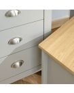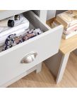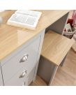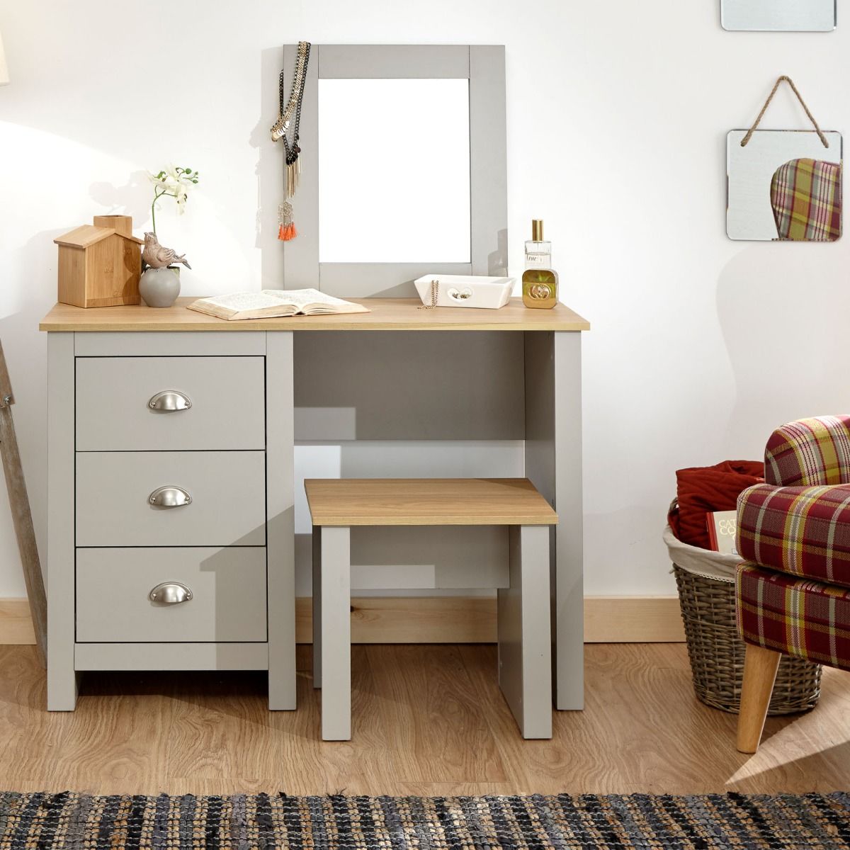 Our Lancaster Dressing Table set features 3 large storage drawers in addition to a conveniently sized working surface and rectangular framed mirror. It is available in a modern soft grey finish with contrasting oak veneer top, the drawers are fitted with our signature ‘Lancaster' satin silver drawer pulls. This set includes the matching stool. Contrasting Oak Effect Top Country Cottage Styling Plenty of Storage Space Assembled Size: 131 x 104 x 44