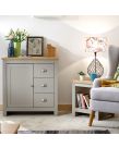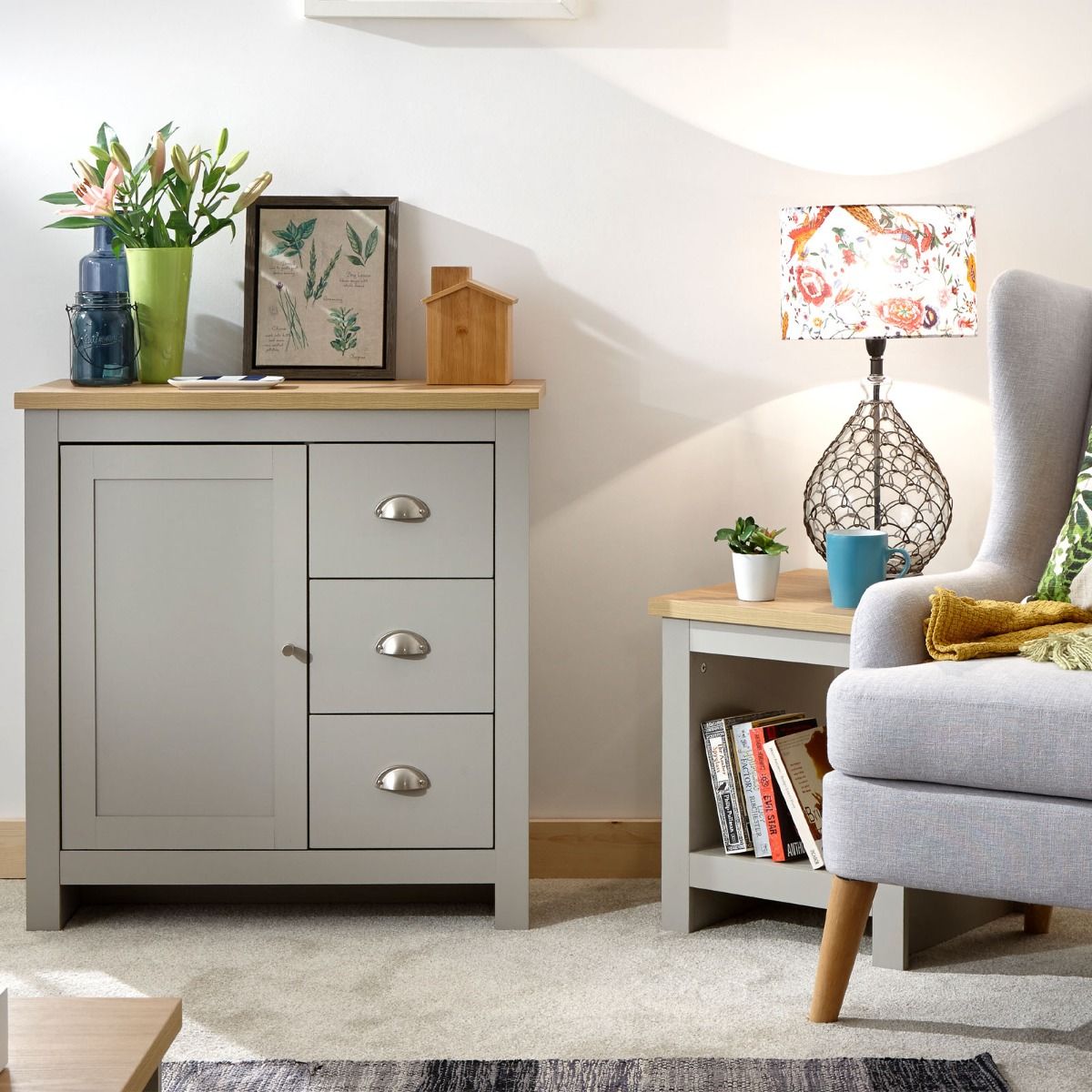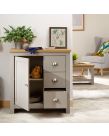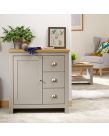 An elegant storage solution for the living or dining room. The Lancaster Multi, with its matte grey or cream finish and oak veneered top matches perfectly with the rest of the Lancaster range and features three handy drawers with satin silver handles and a spacious cupboard fitted with satin silver knobs. Contrasting Oak Effect Top Country Cottage Styling Plenty of Storage Space Assembled Size: 81 x 79 x 35