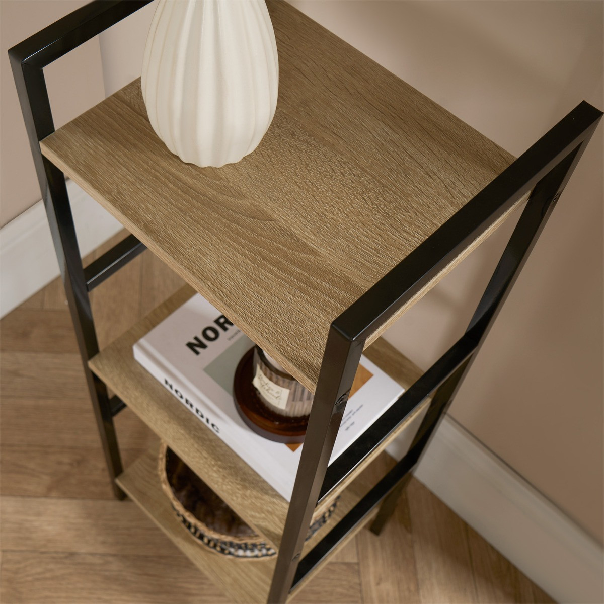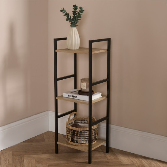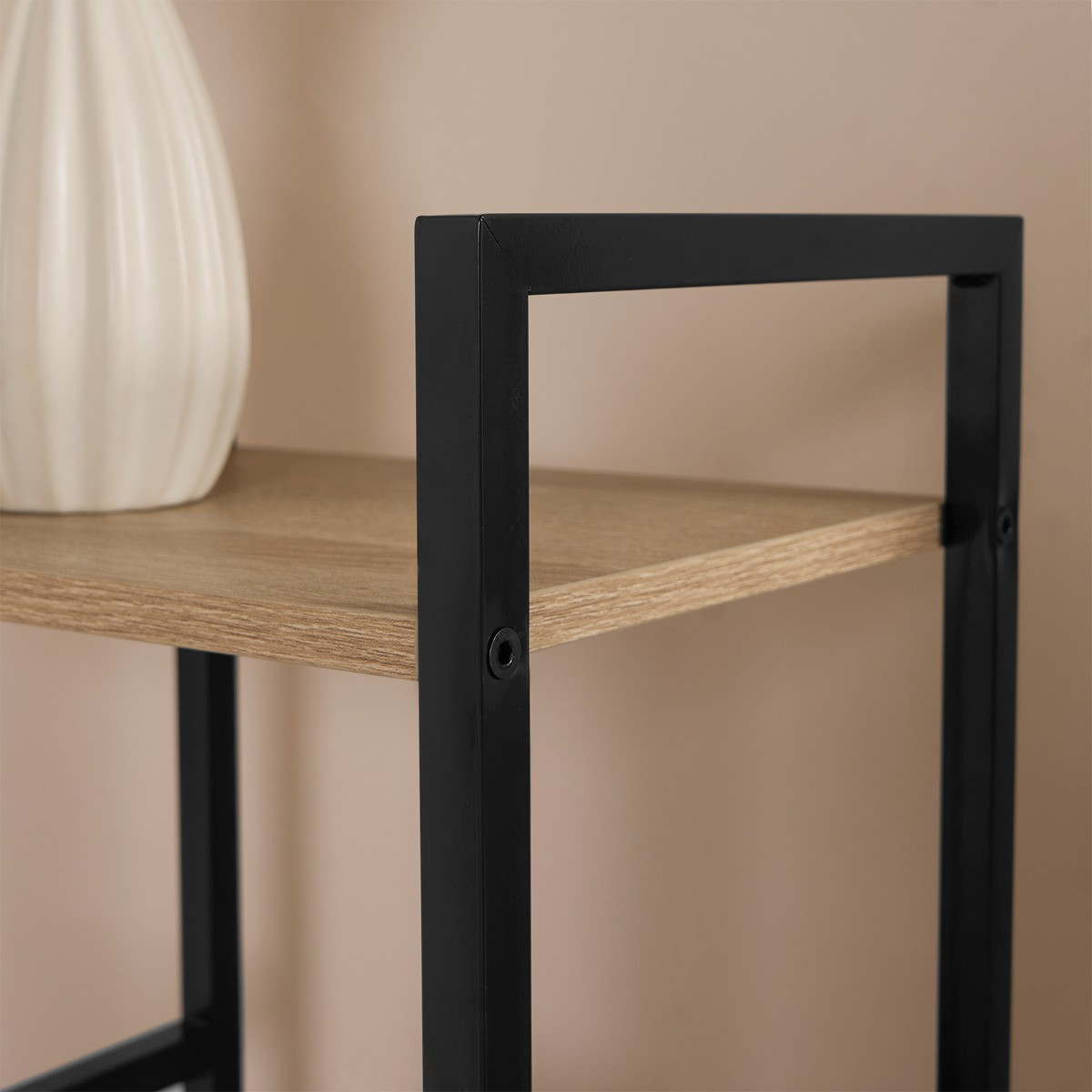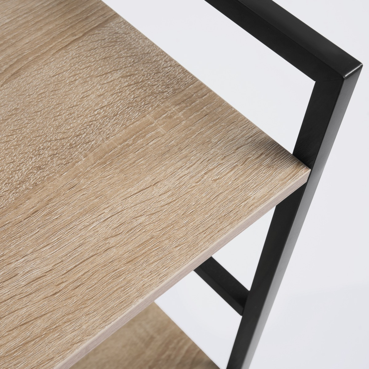 Elevate your storage and display solutions with the OHS Manhattan 3-Tier Shelving Unit. This sleek and functional shelving unit blends the warmth of wood with the modern edge of black metal, offering a stylish and practical addition to any room. The shelving unit features a combination of rich wooden shelves and a sturdy black metal frame. This blend of materials adds a contemporary and industrial touch to your decor, making it a versatile piece for various interior styles.