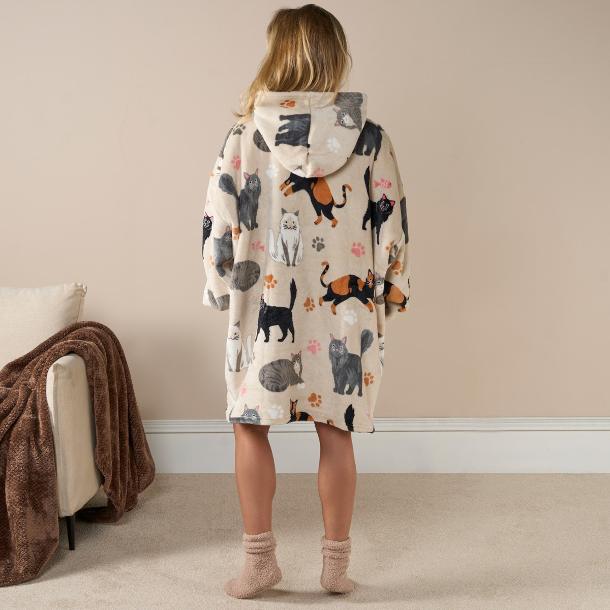 OHS Adults Cat Print Hoodie Blanket - Beige