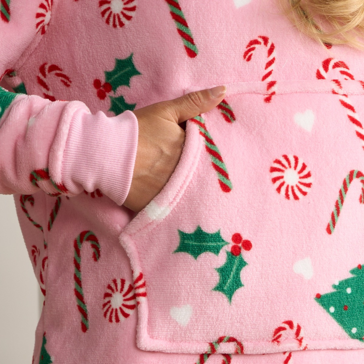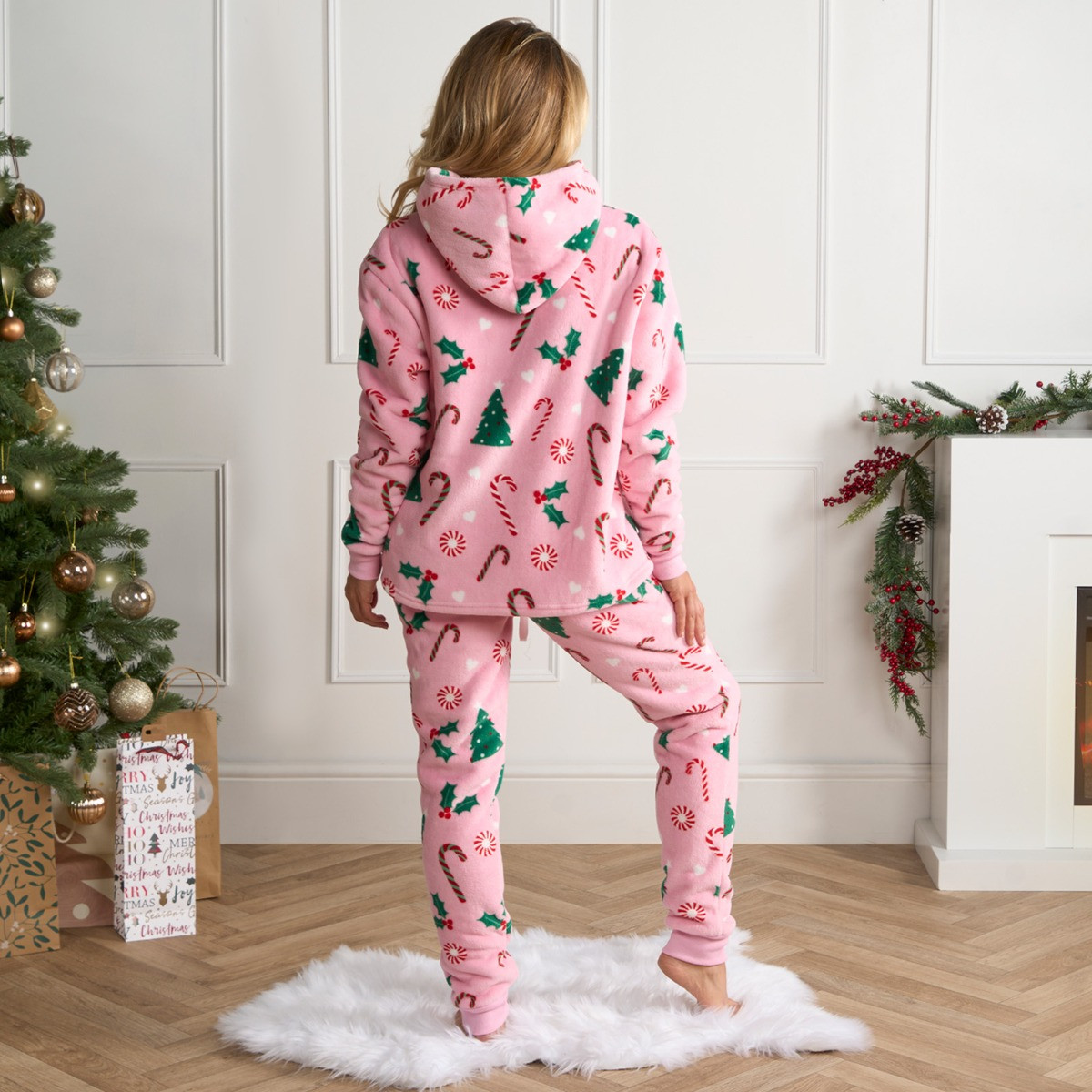 OHS Adults Christmas Candy Cane Fleece Hoodie Pyjama Set, Pink - Large