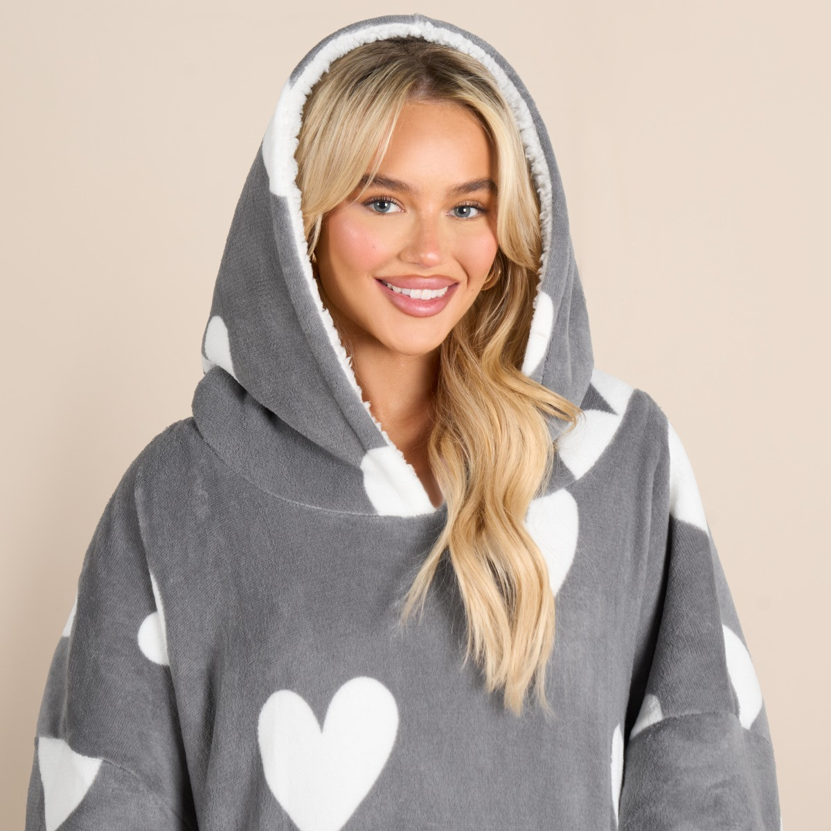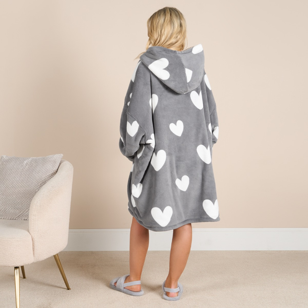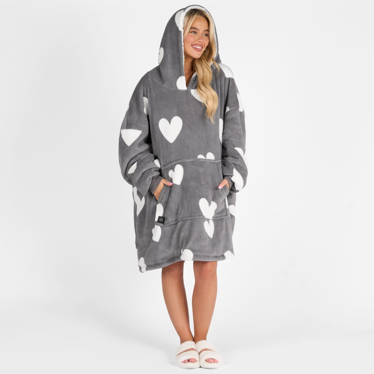 OHS Adults Heart Print Heated Hoodie Blanket - Charcoal