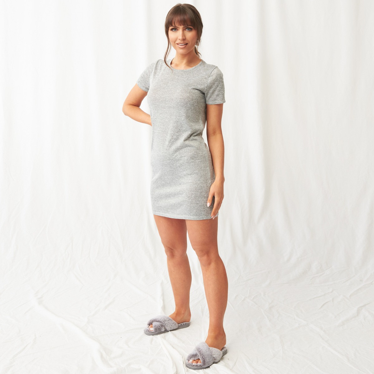 This grey jersey t-shirt dress will make the ultimate off-duty outfit for lounging around your home in. Featuring short sleeves and a scoop neckline, style this with your favorite pair of slippers and you’re ready for the perfect night in.