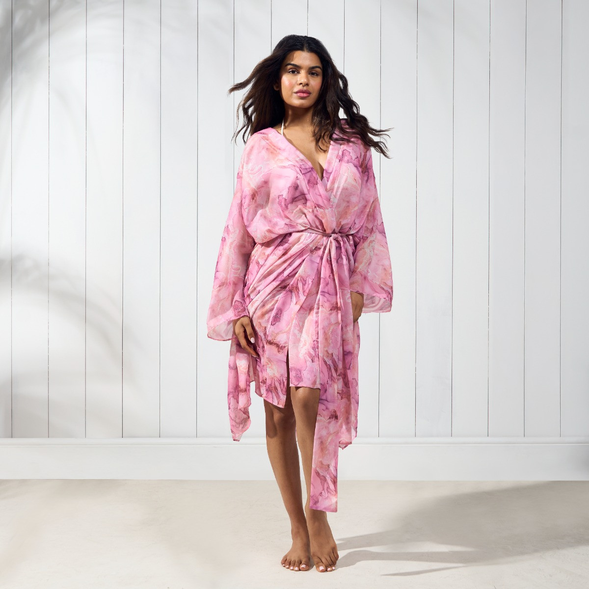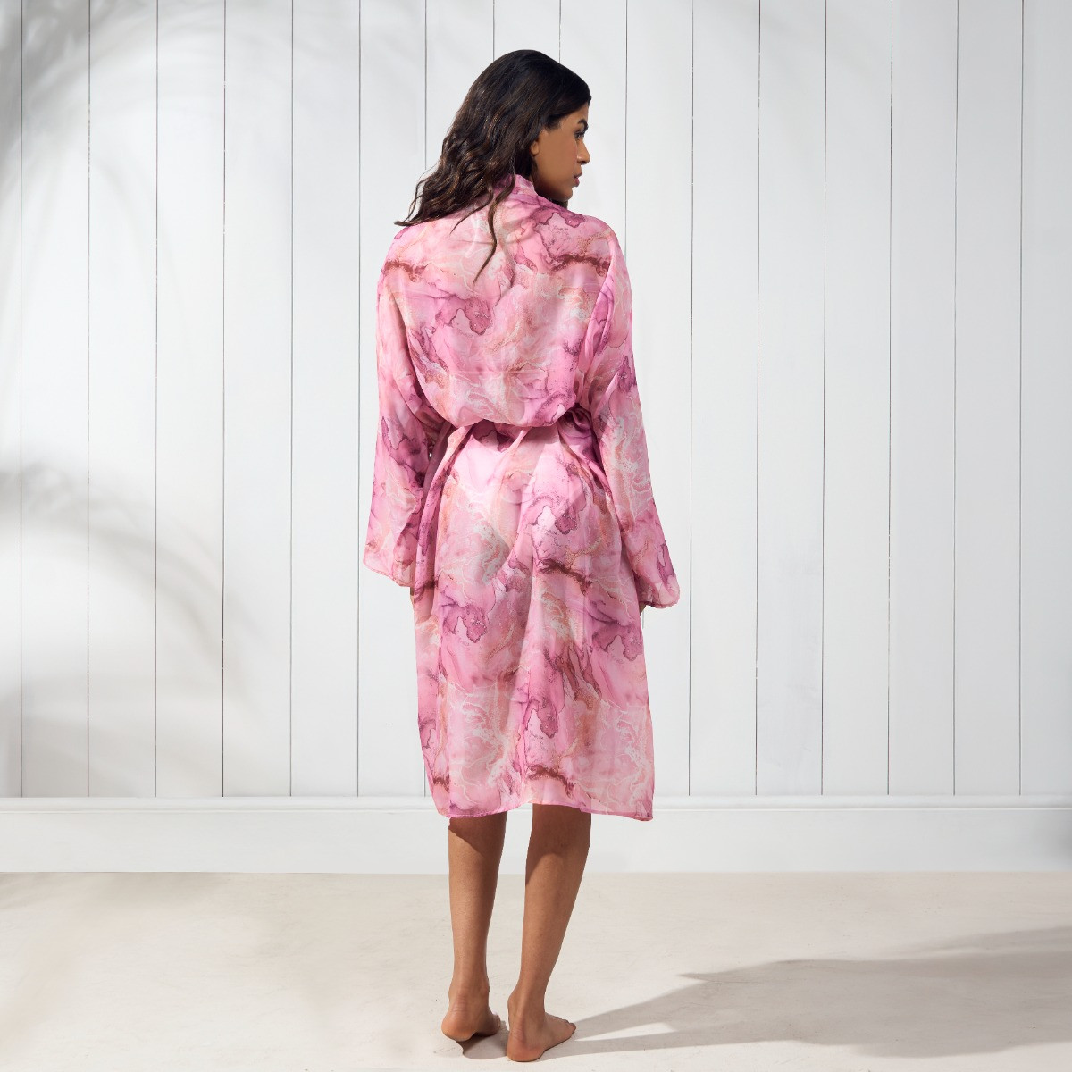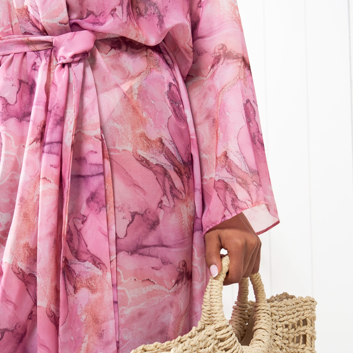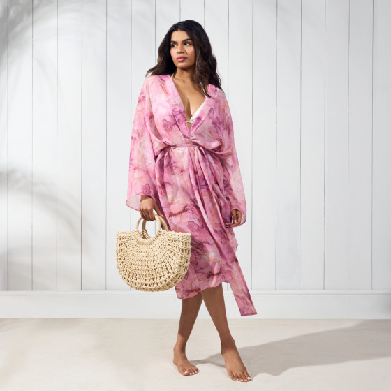 The OHS Belted Marble Print Beach Kimono is the perfect blend of elegance and ease for your next getaway. With its flowing silhouette and mesmerising marble design, this lightweight cover-up adds a touch of effortless style to any beach or poolside look. The belted waist allows for an adjustable fit, making it as practical as it is chic. Throw it over your swimwear for a sophisticated finish or layer it for a relaxed, breezy feel.