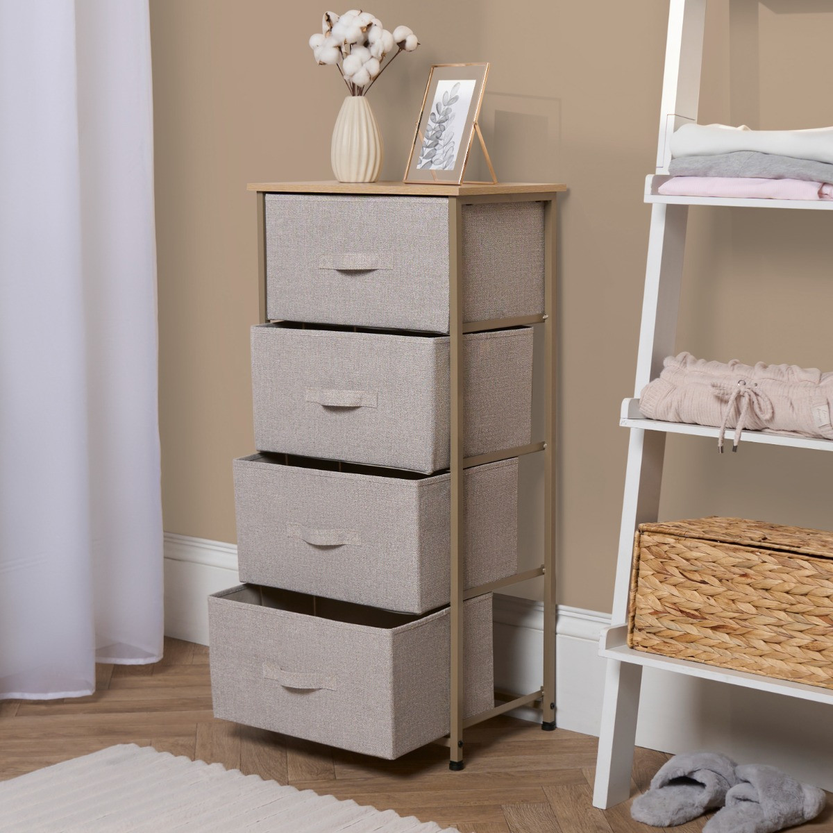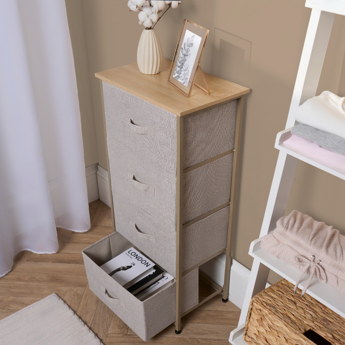 The OHS Brooklyn 4 Drawer Fabric Cabinet is a sleek and functional storage solution designed to bring order and style to any room. Featuring four spacious drawers, this cabinet provides ample space for organising your belongings, from clothes and accessories to household essentials. The durable fabric drawers offer a soft, contemporary look, while the sturdy frame ensures long-lasting use. With its minimalist design and versatile functionality, this cabinet is the perfect addition to any bedroom, living room, or hallway, seamlessly blending into a variety of interior styles.