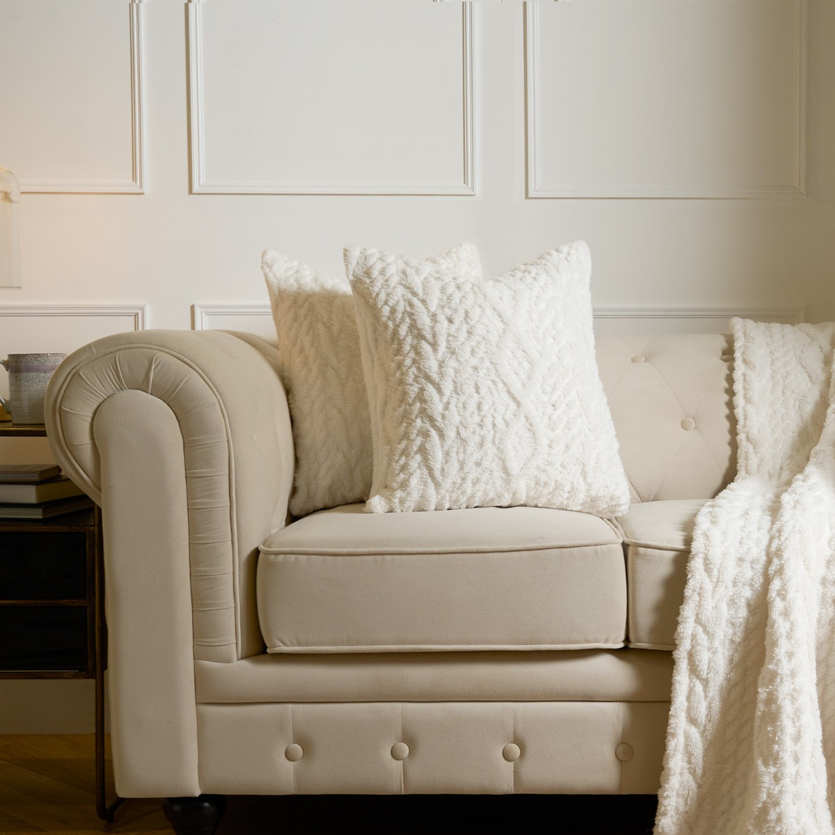 Enhance your living space with the OHS Cable Knit Cushion Covers. These stylish cushion covers feature a classic knitted design, adding a touch of timeless elegance to any room. The soft and cosy teddy texture provides ultimate comfort, making them perfect for snuggling up against. With their neutral cream colour, these cushion covers effortlessly complement a variety of interior styles, offering both sophistication and warmth.