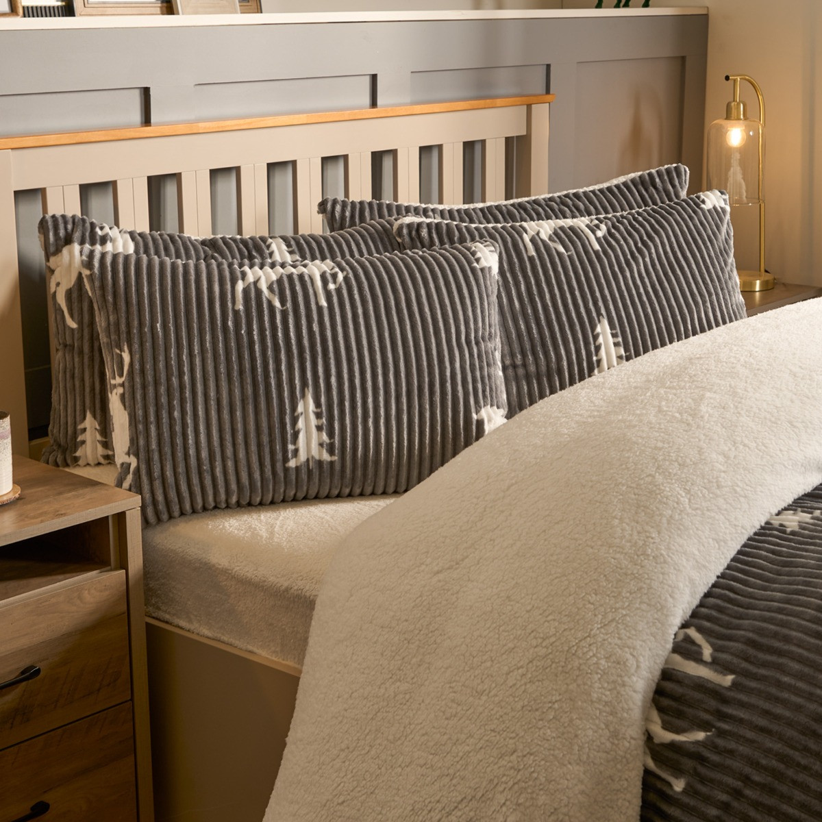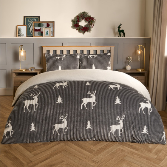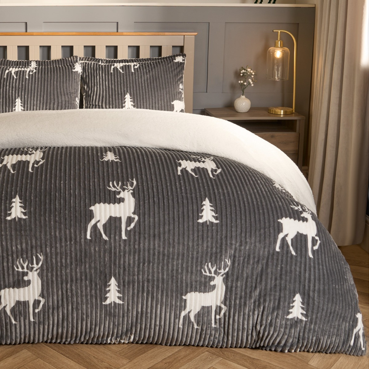 OHS Cosy Stag Ribbed Fleece Duvet Set, Grey - Double
