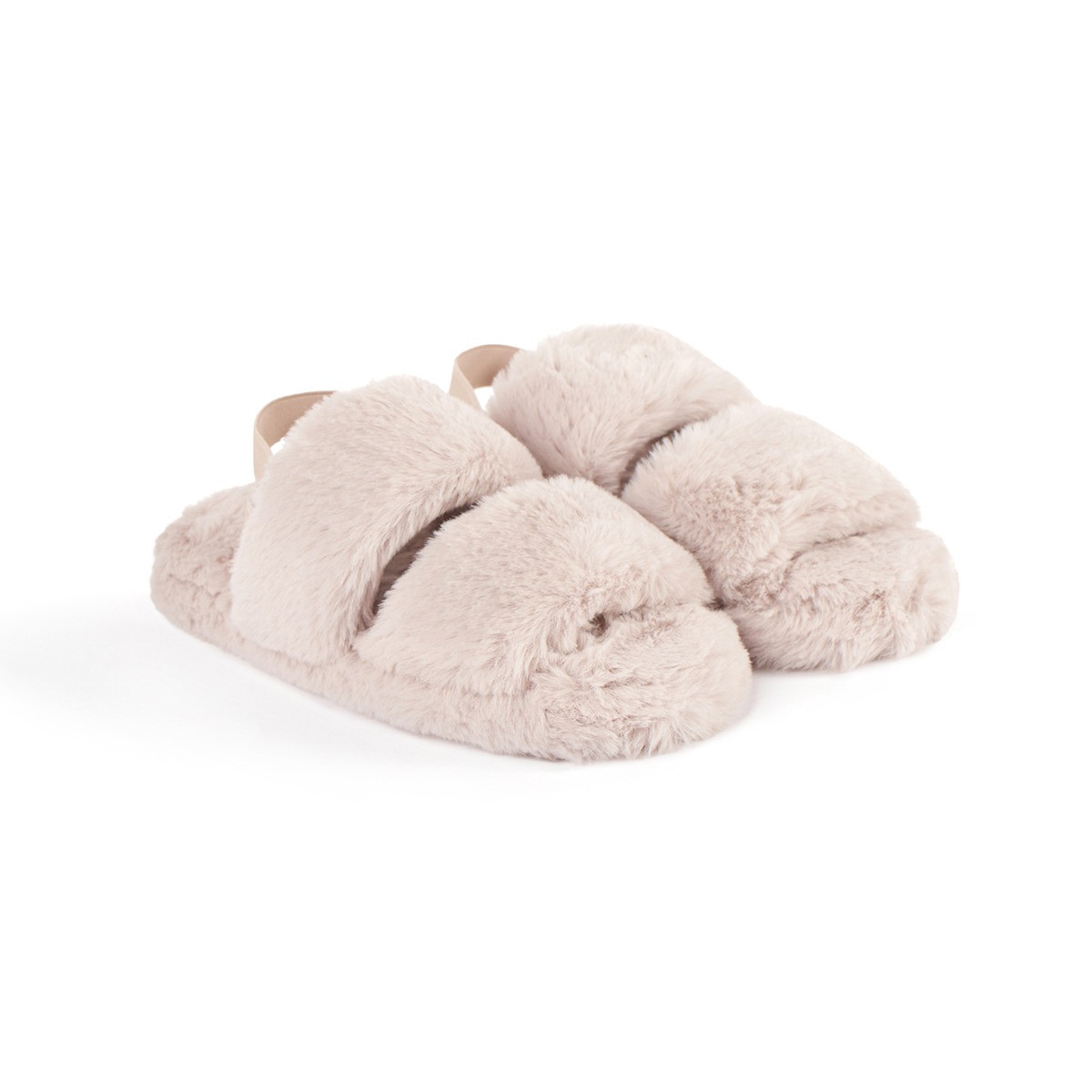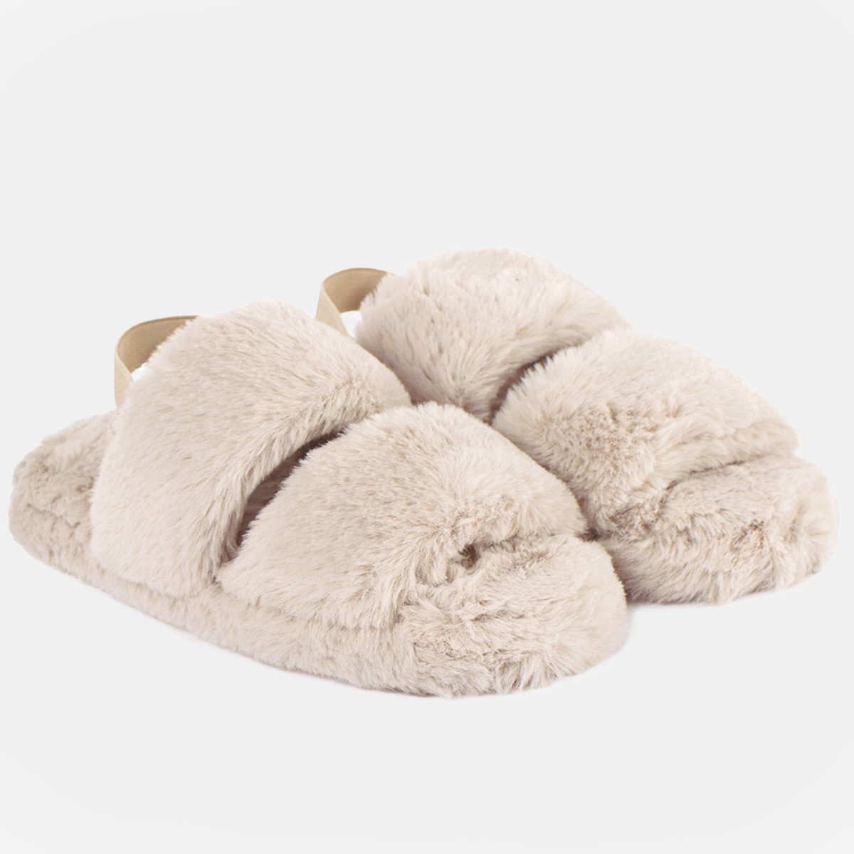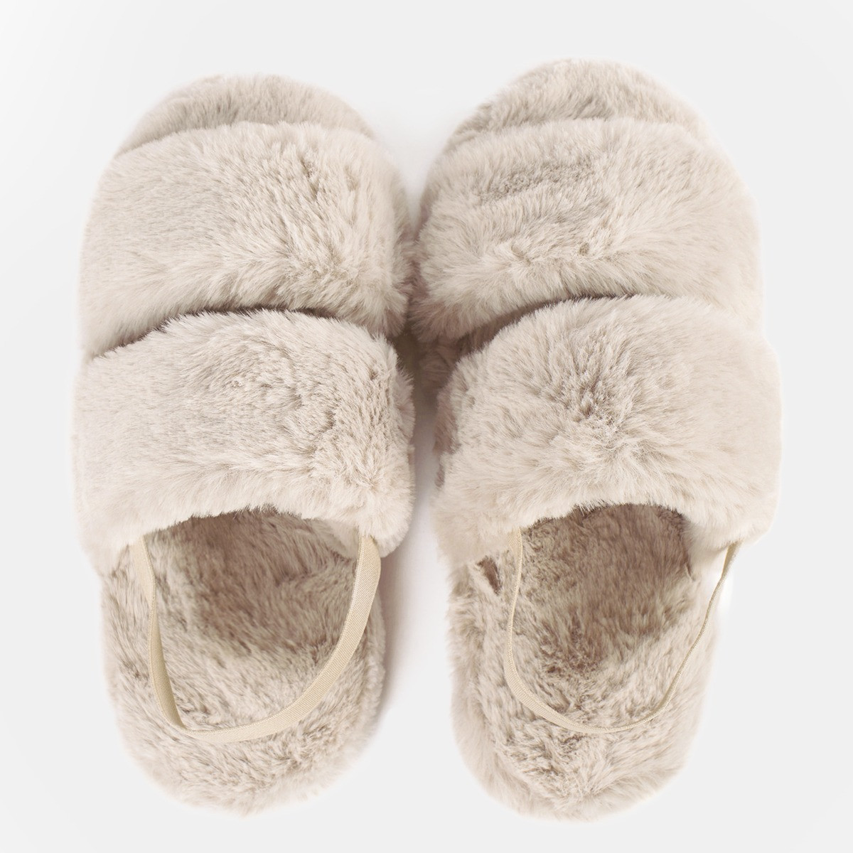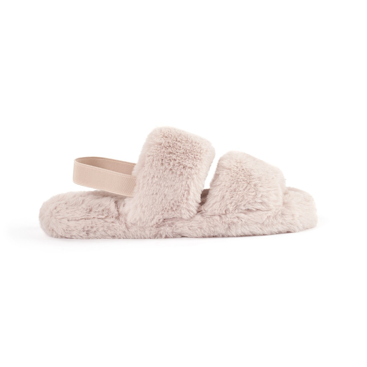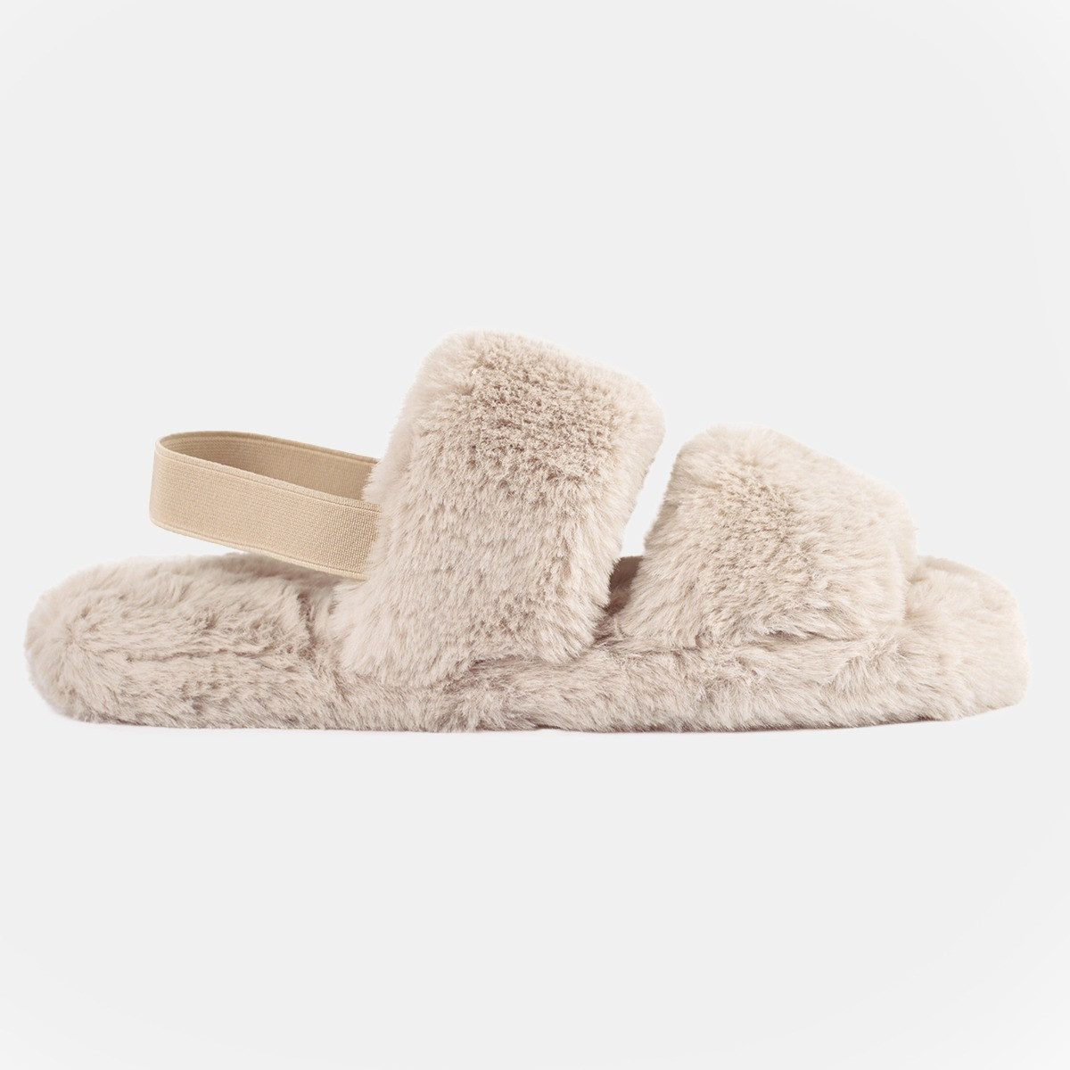 Relax in our faux fur platform slippers which are soft and cosy, making them perfect for lounging around or for the ultimate working from home look. This cosy pair of slider style slipper has a front strap an a elasticated back strap for a snug fit, both sole and strap are a plush faux fur material. They have been crafted with a thick platform rubber sole for durability and ultimate comfort.