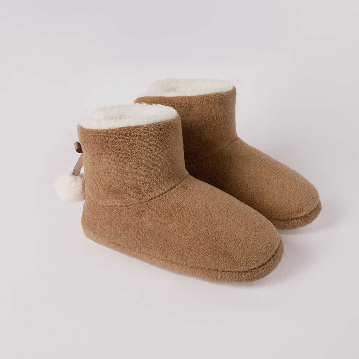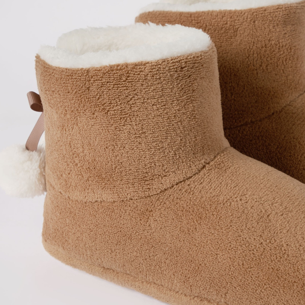 Comfy, stylish and snuggly, our boot slippers are soft and cosy, making them perfect for lounging around or even for the ultimate working from home look. This cosy pair of boot style slippers has a Sherpa lining for a cosy, snug fit, the outer material is a suede fleece material. These boot slippers also feature an added bow and pom poms on the back for the perfect finish. They have been crafted with a rubber sole for durability and comfort.