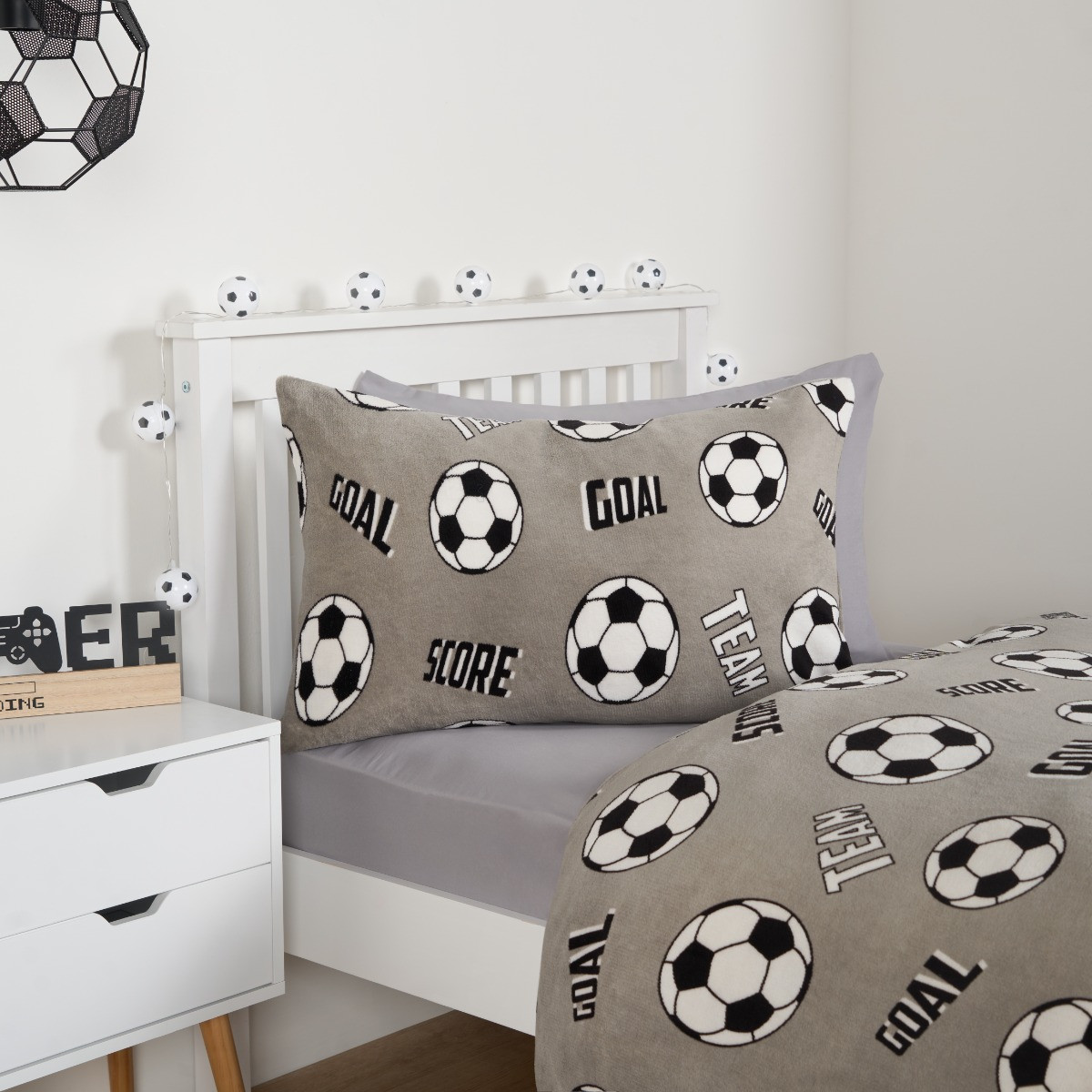 The OHS Football Fleece Duvet Set is an ideal choice for football enthusiasts who want to bring their love for the game into their bedroom decor. This duvet set features a repeating football motif set against a sleek grey background, making it stylish and sporty. Scattered across the design are rallying football words like "GOAL" and "SCORE" adding an extra touch of excitement. Made from soft and cosy fleece material, this duvet set is perfect for staying warm and comfortable, especially during colder nights. It's not just functional but also a great way to showcase your passion for football, making it a fantastic addition to any football fan's room.