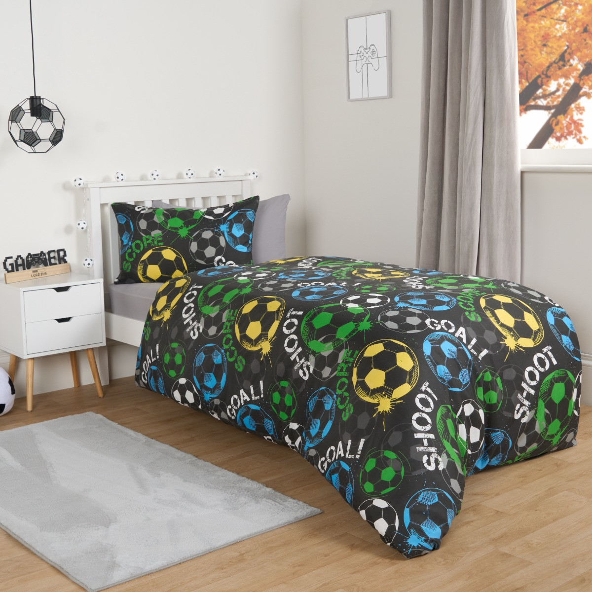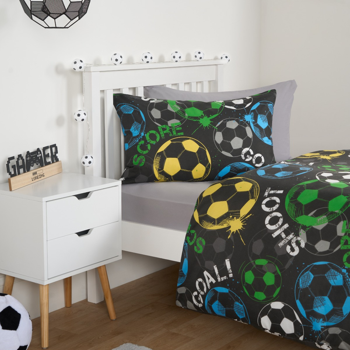Introducing the OHS Football Graphic Reversible Duvet Cover Set, designed to score big with any young football fan. One side features stylised footballs in various colours against a sleek black background, complemented by dynamic football terms like "GOAL!" for an energetic look. The reverse side showcases a repeating pattern of smaller footballs on a dark striped background, offering a versatile and stylish alternative. Crafted from soft fabric, this duvet cover set provides both comfort and durability. Perfect for adding a sporty touch to your child's bedroom, the OHS Football Graphic Reversible Duvet Cover Set combines fun design with practical comfort.