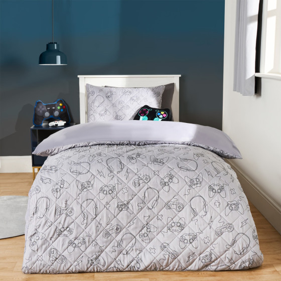 OHS Gaming Print Quilted Duvet Cover Set, Grey - Single