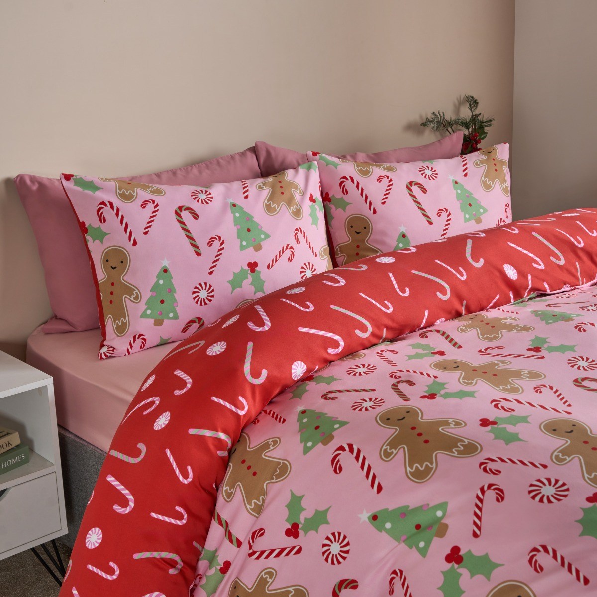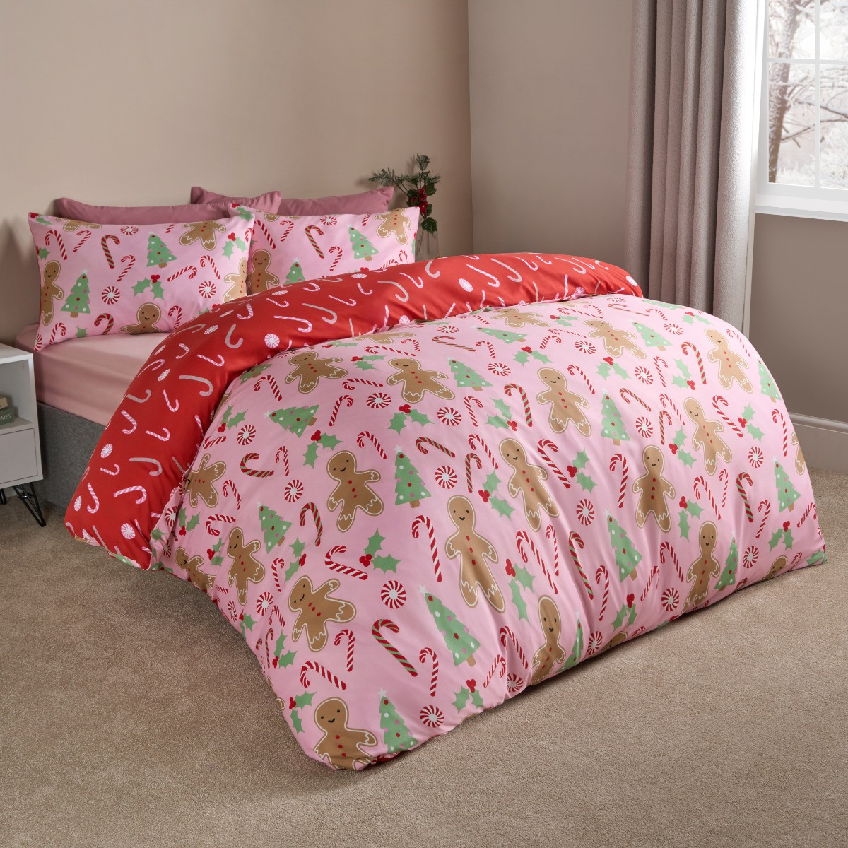 OHS Gingerbread Man Candy Cane Reversible Duvet Set, Pink - Single