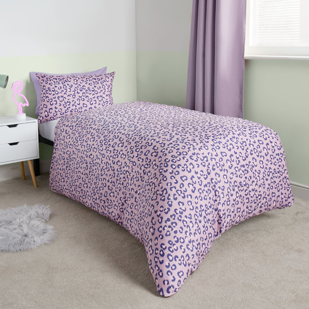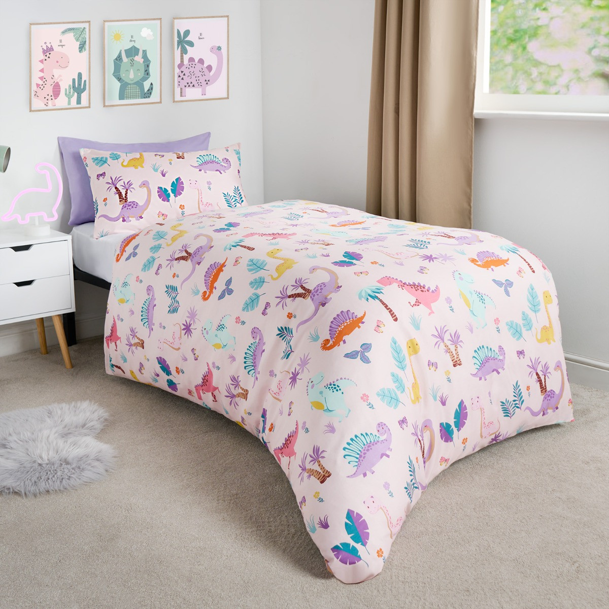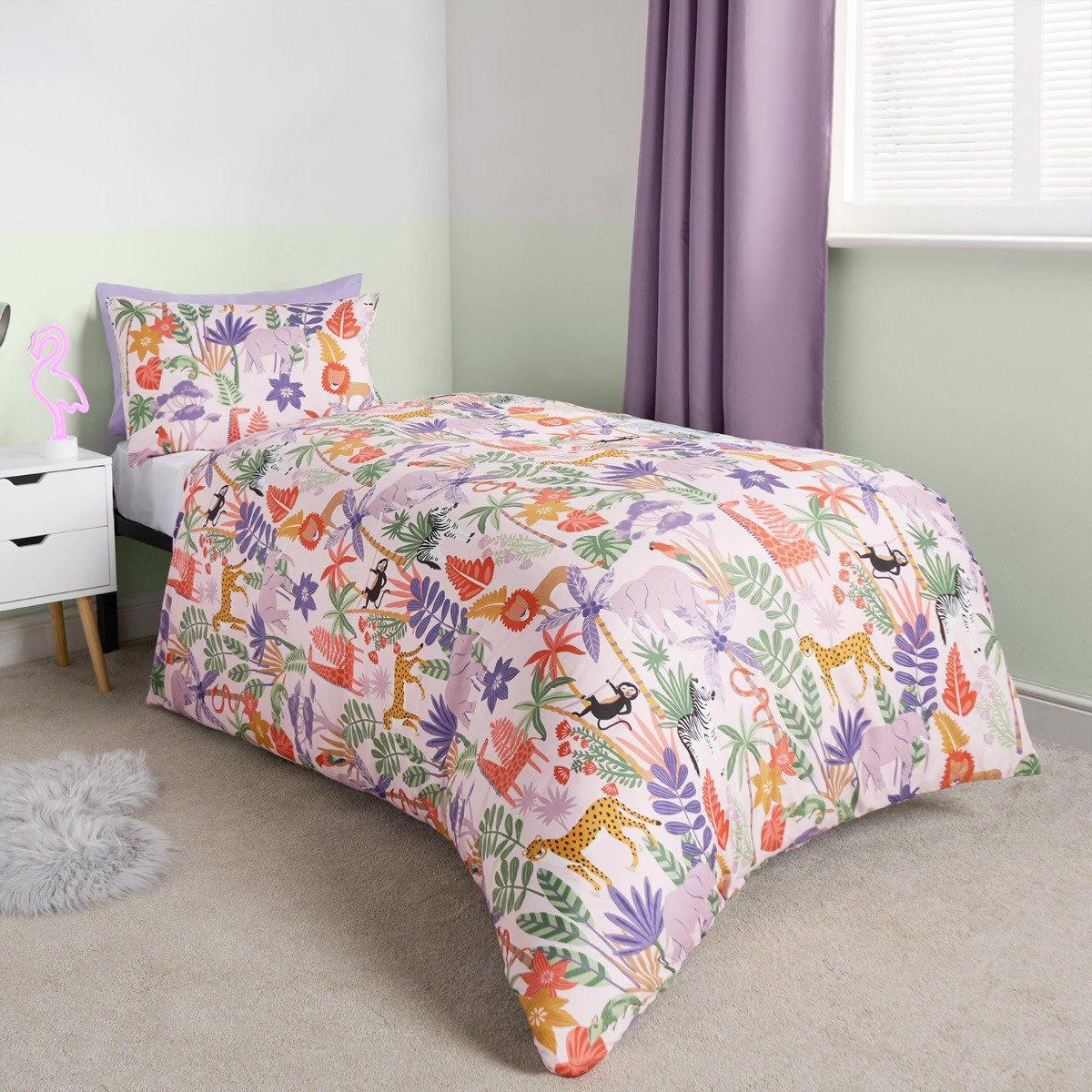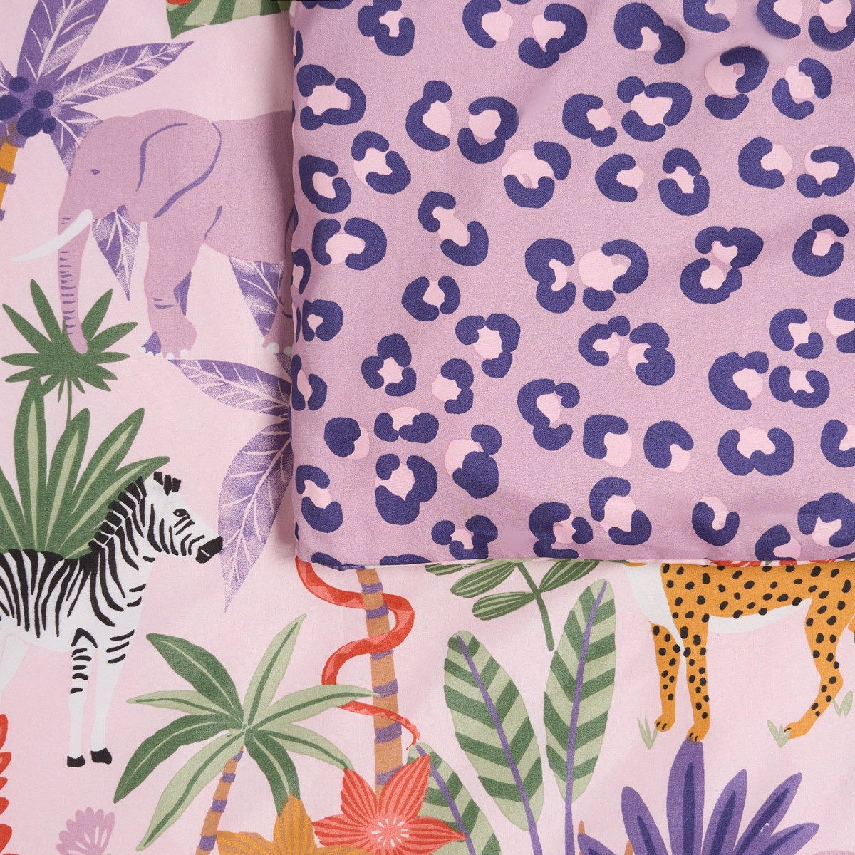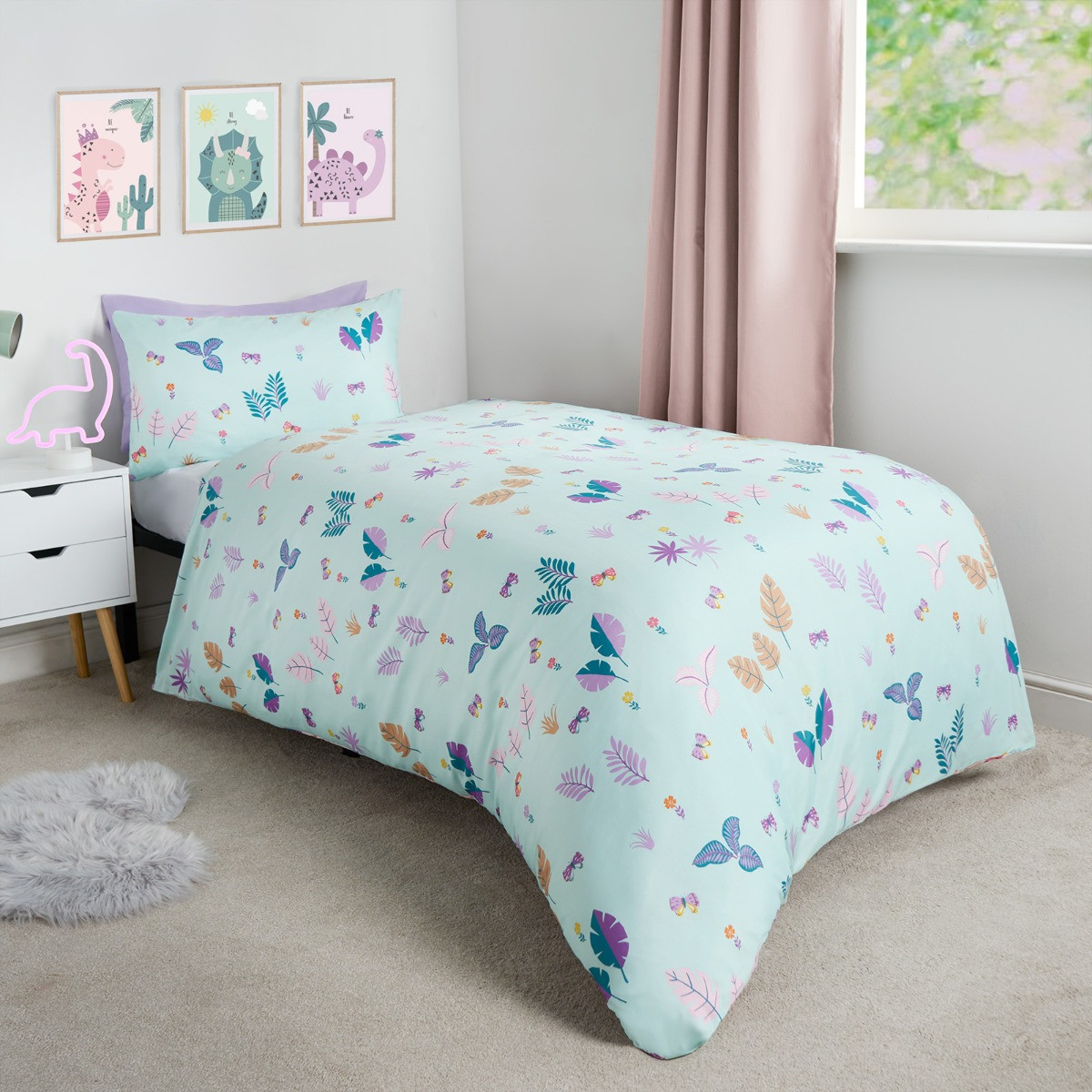 Delight your little one with our OHS Girls Dino & Safari Duvet Cover Sets. The first set features adorable pastel dinosaurs roaming across a soft blush pink background, perfect for sparking imaginations. For a refreshing and calming look, flip it over to reveal a serene light blue backdrop adorned with lovely leaves and foliage. The second set showcases a playful safari print with charming illustrations of lions, monkeys, giraffes, zebras, and lush foliage on a soothing lilac background. For a fun and stylish change, simply flip the duvet cover to reveal a pattern of purple animal spots. This twin pack offers versatile, reversible designs that make bedtime exciting and room makeovers easy, providing a delightful blend of whimsy and tranquility. Available in the following size: -
