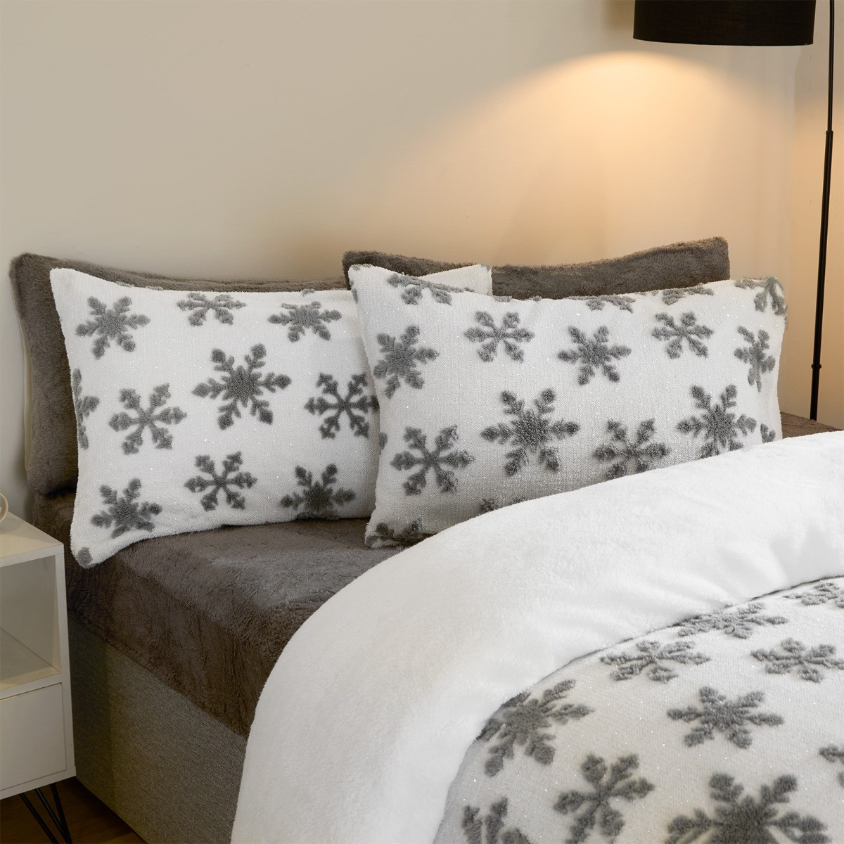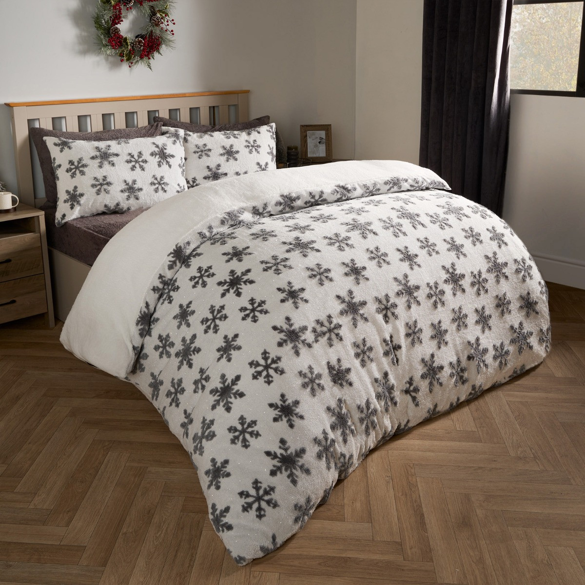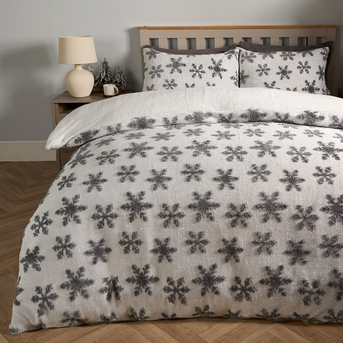 OHS Snowflake Glitter Tufted Teddy Duvet Set, Grey - Single