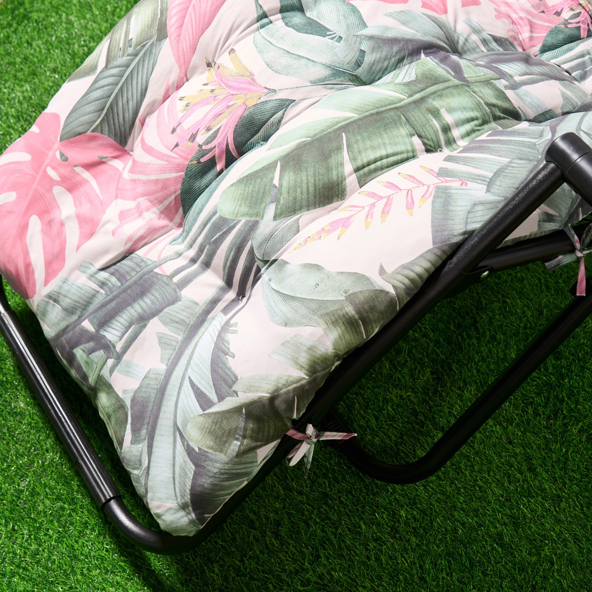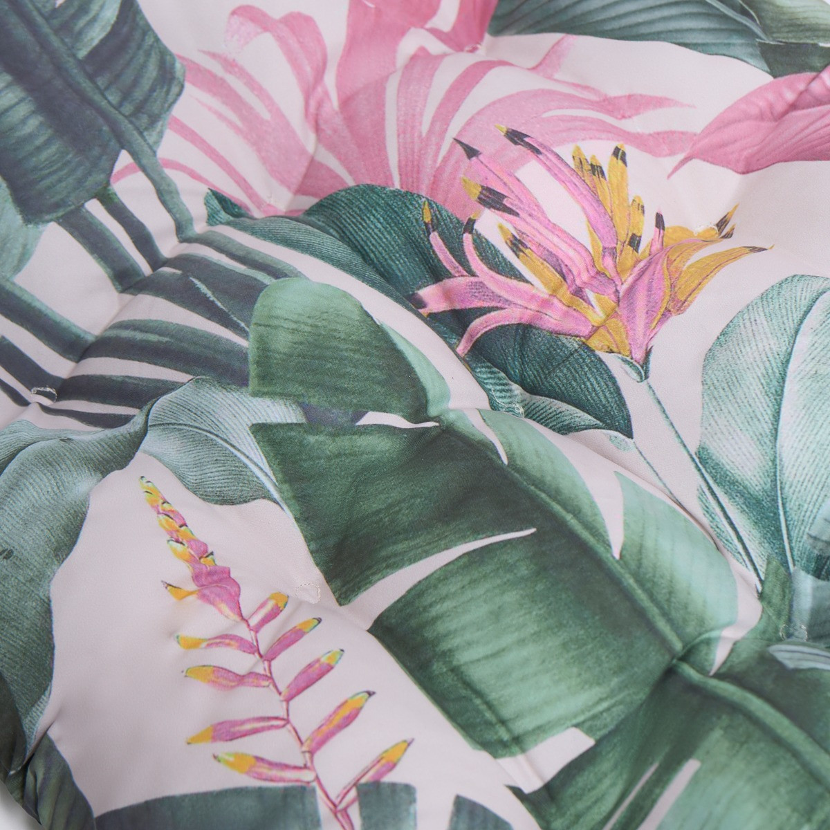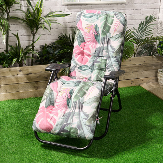 The OHS Gravity Chair Cushion in a tropical print brings a vibrant and exotic touch to your seating. Designed to fit most gravity chairs, this cushion features a lush green tropical pattern that adds a fresh, nature-inspired look to your outdoor or indoor space. With ample padding for comfort, it ensures a relaxing lounging experience. Perfect for warm days and outdoor gatherings, it is equally suitable for indoor use. To maintain its condition, store in a dry, indoor place when not in use.