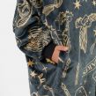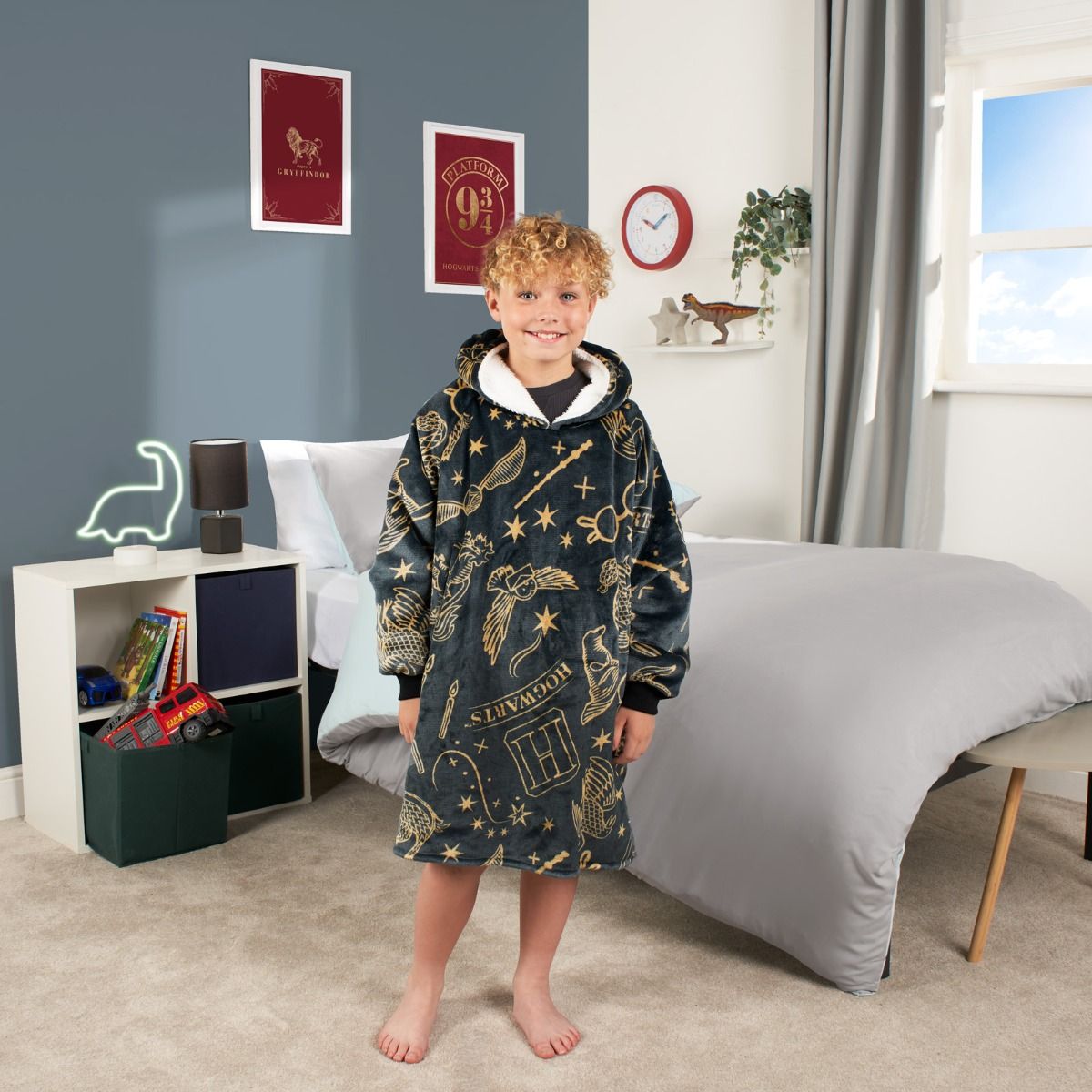 Introducing the OHS Harry Potter Hoodie Blanket in blue, featuring golden Harry Potter motifs against a black background. Get your little one wrapped up and cosy for a comfy night in with this stylish loungewear, great for staying warm during a Harry Potter marathon. Featuring a sumptuously soft outer fabric and a cosy sherpa fleece lining, this hoodie blanket makes for a comforting gift for family and friends alike. Expertly matched with elastic cuffs and a double opening front pocket, this hoodie is guananteed to put a smile on your little one's face.