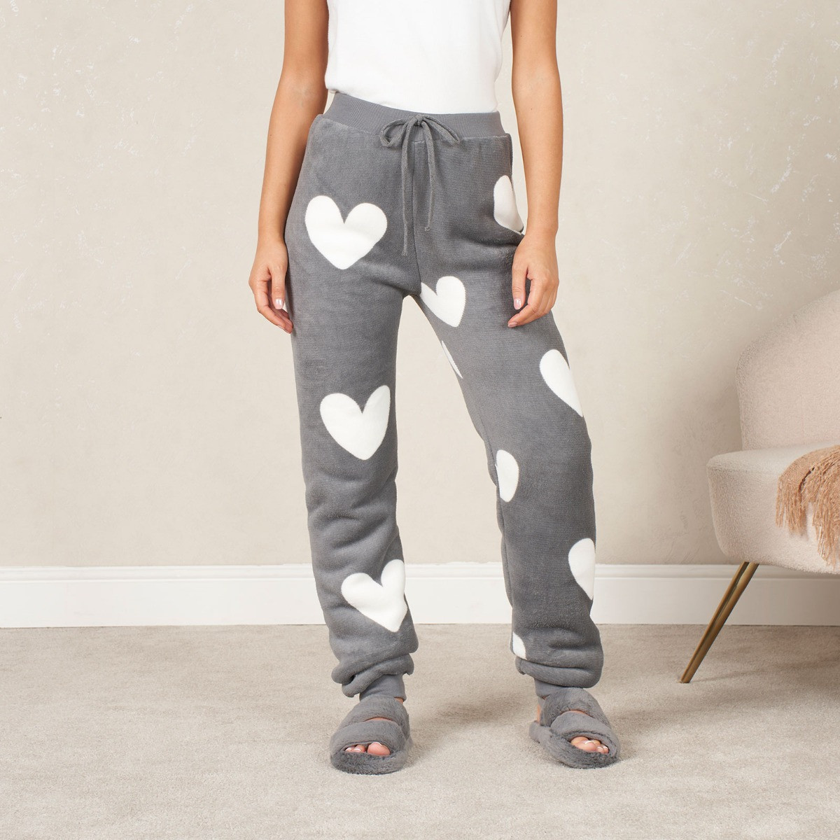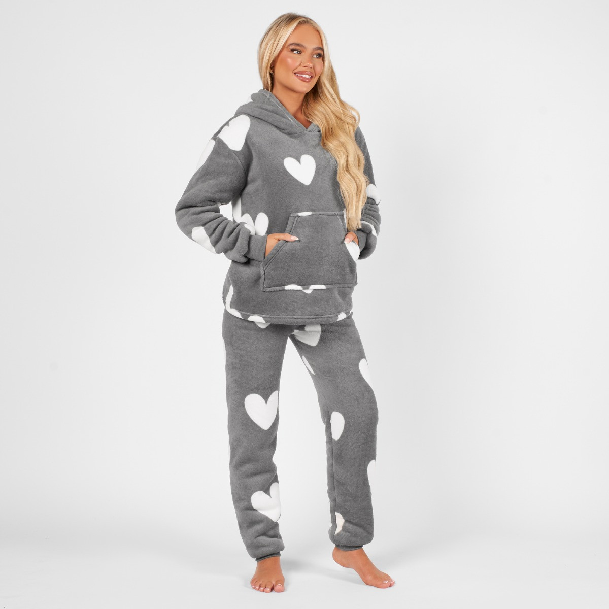 OHS Heart Print Coral Fleece Pyjama Set, Charcoal - Medium